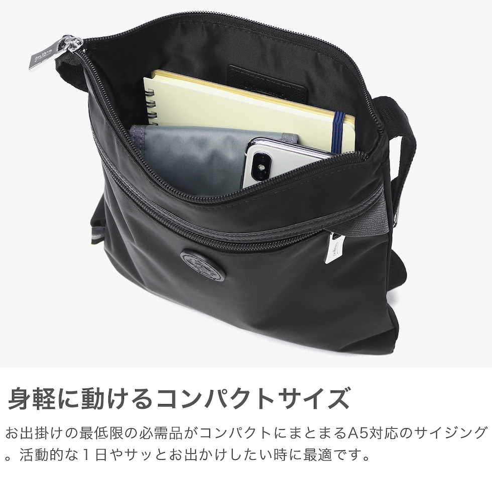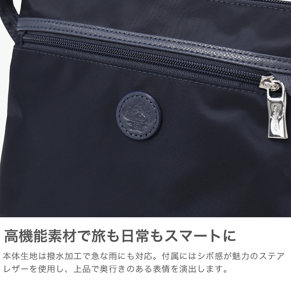 | 旅も日常も軽やかに 洗練デザインと機能性 洗練されたデザインと高い機能性を備えた、トラベルシリーズ『VIAGGETTO』のショルダーバッグです。環境に優しいリサイクルナイロンと上質な牛革を使用し、軽量かつ撥水性にも優れています。コンパクトながら、財布やパスポートなど必要なものをしっかり収納可能。旅先でも日常でも快適に使える、上品な逸品です。 |
