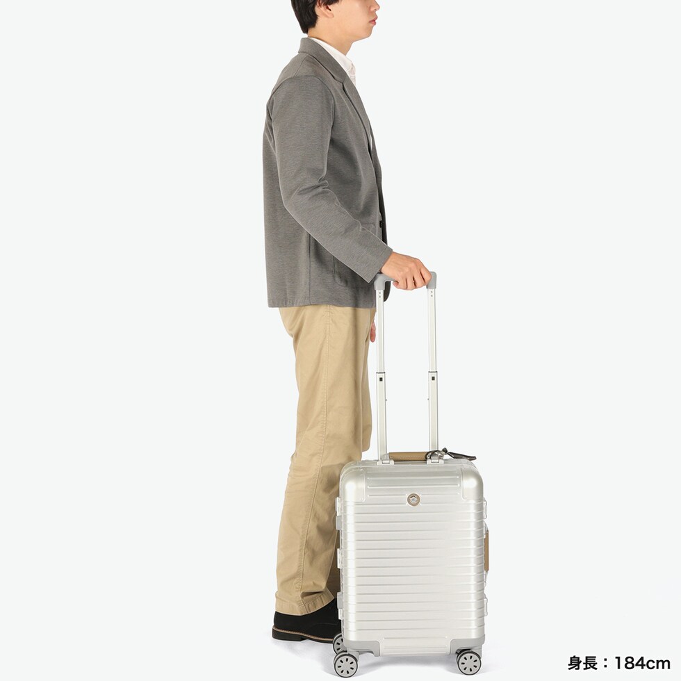 アルミ製キャリーケース 「Orobianco」初のアルミ合金製ラゲージ『MOVENZA/モヴェンツァ』。こちらは、36L容量のスーツケースです。ヘアライン加工された高級感のあるアルミボディに、手仕事が光るレザーハンドルが特徴。取り外し可能な仕切りを付属するなど機能的な設計。洗練されたラグジュアリー感と上質な存在感を放つ逸品に仕上がっています。 |
