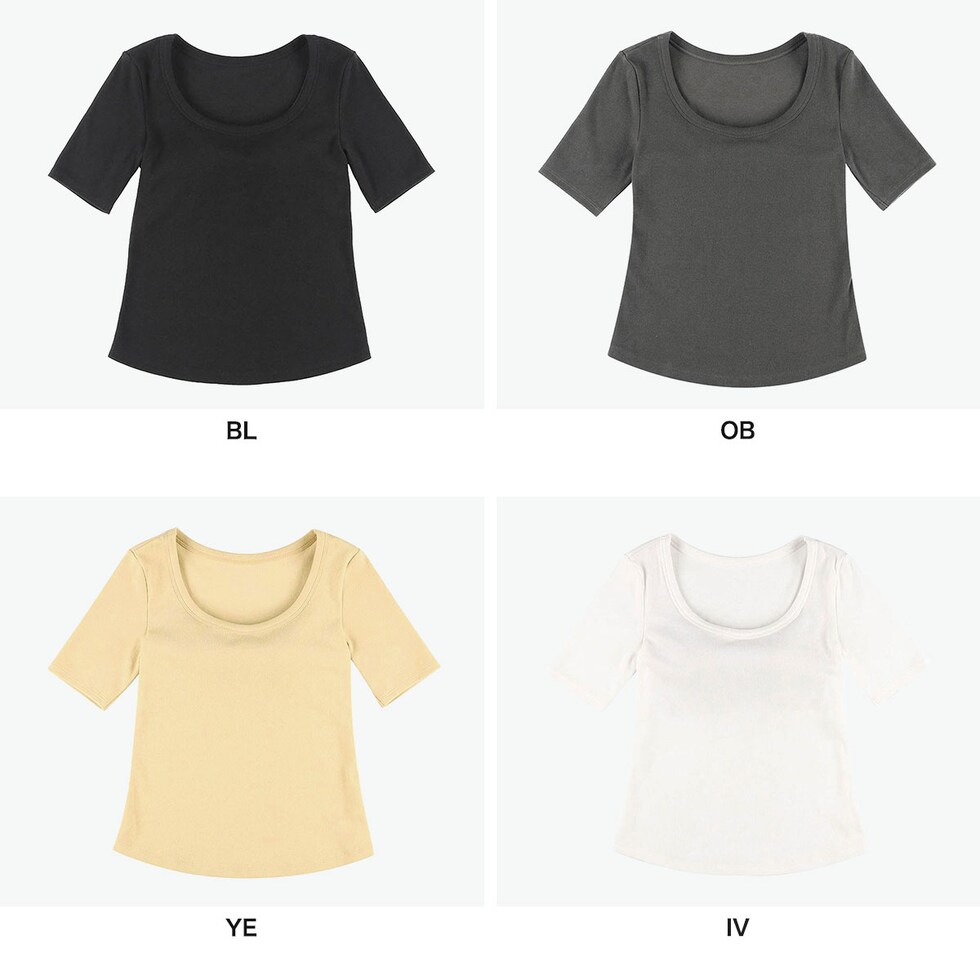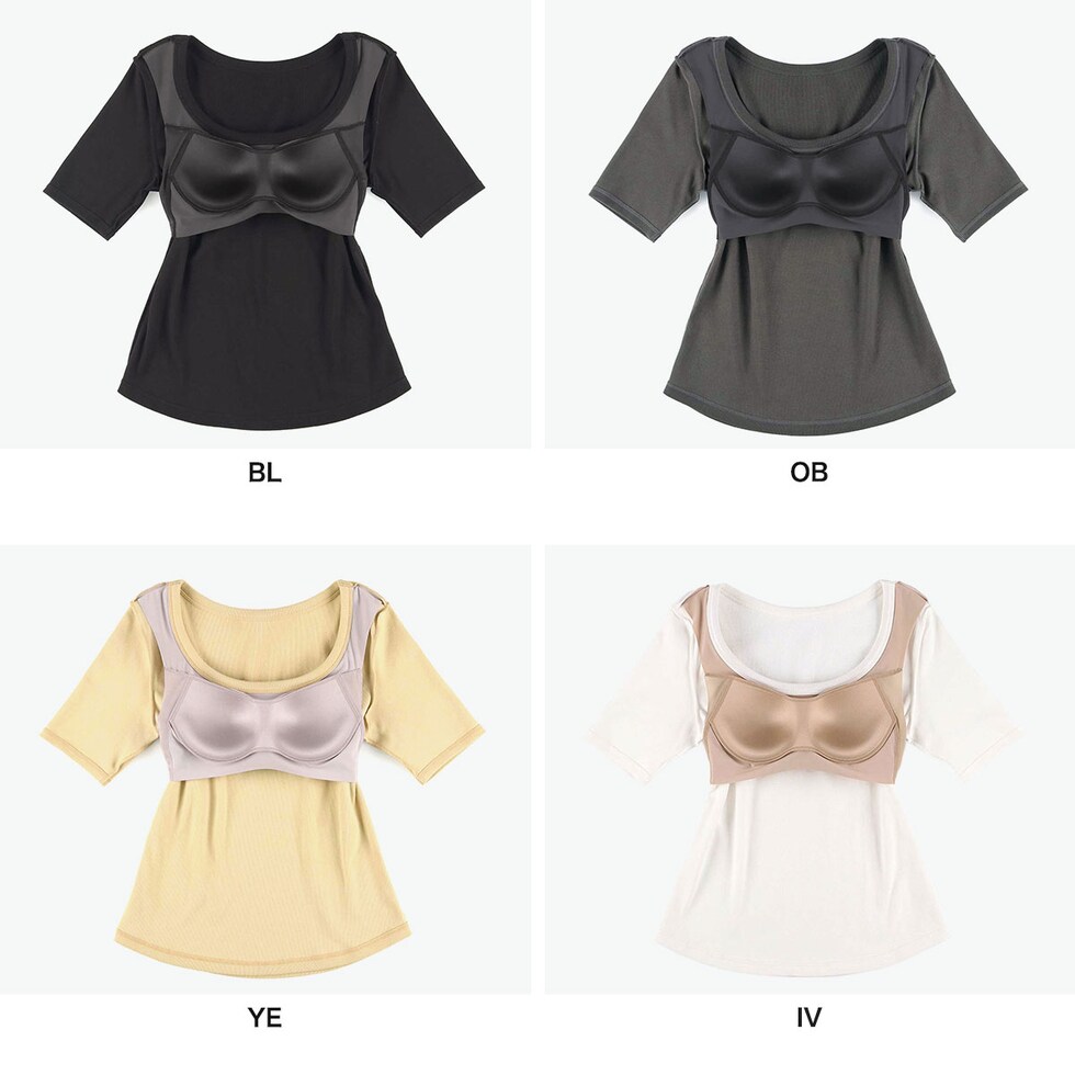 アワワコール Tシャツ レディース OUR WACOAL カップ付き アウター トップス Uネック 4分袖 アンダーゴムなし パット シンプル 無地 リブ ストレッチ カップインTシャツ JCX351