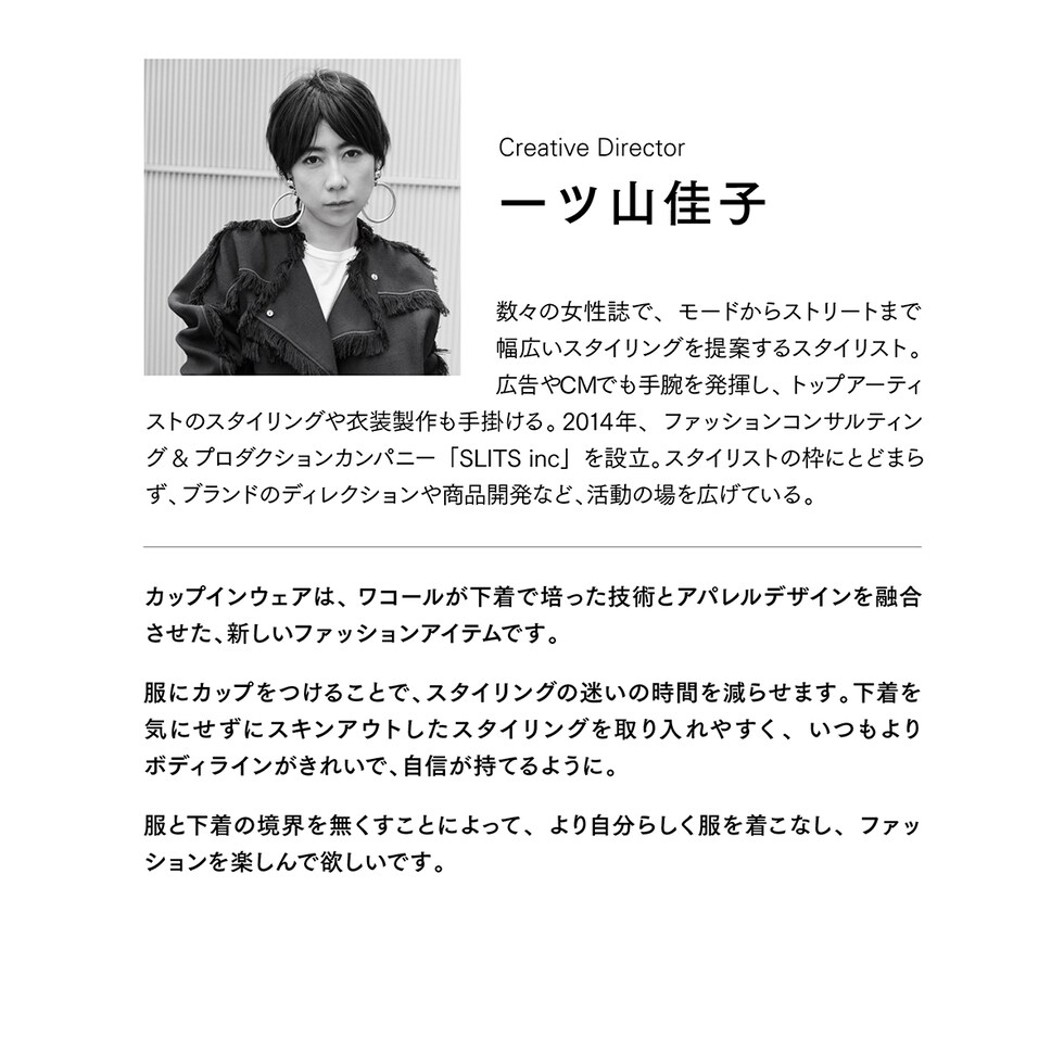 | 1枚で着こなせる バックオープントップス 下着選びに迷いがちなバックオープンスタイルも、1枚で着こなせるカップ付きのリブTシャツです。袖丈が長い、スリット入りのデザイン。下着メーカーならではのこだわりが詰まったカップは、自然で綺麗なバストシルエットを追求しました。 |