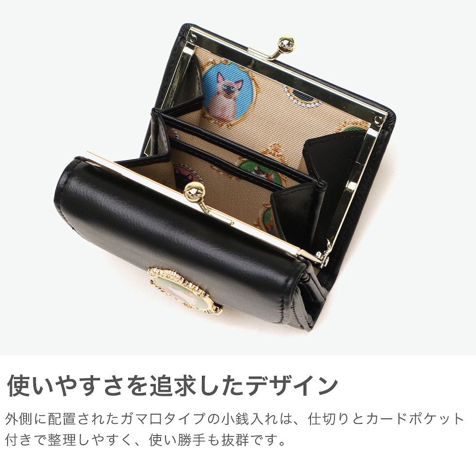 大人のミニ財布 まるで絵画のような猫のブローチ風メタルが高級感を演出する、おしゃれな『CAT BROOCH』シリーズ。裏地も猫尽くしのデザインになっていて、猫好きさんにはたまりません♪がま口タイプの小銭入れが使いやすい、大人可愛いミニ財布です。 |