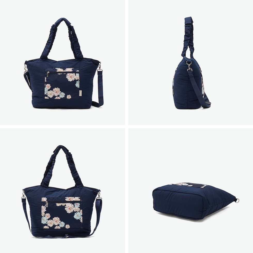 2WAYトートバッグ 軽量なポリエステルツイル素材のトラベルトートが新登場。前後ポケットのみのプリントデザインが施されていて、日常使いにも馴染む仕上がりです。ギャザーハンドルがおしゃれなアクセントになっています。背面はスーツケースのキャリーバーに装着可能。また、オリジナルショルダーストラップ付きの2WAY仕様で、実用性にも優れています。収納や小物入れに便利な同柄の巾着も付属し、1~2泊の旅行に最適です。 |