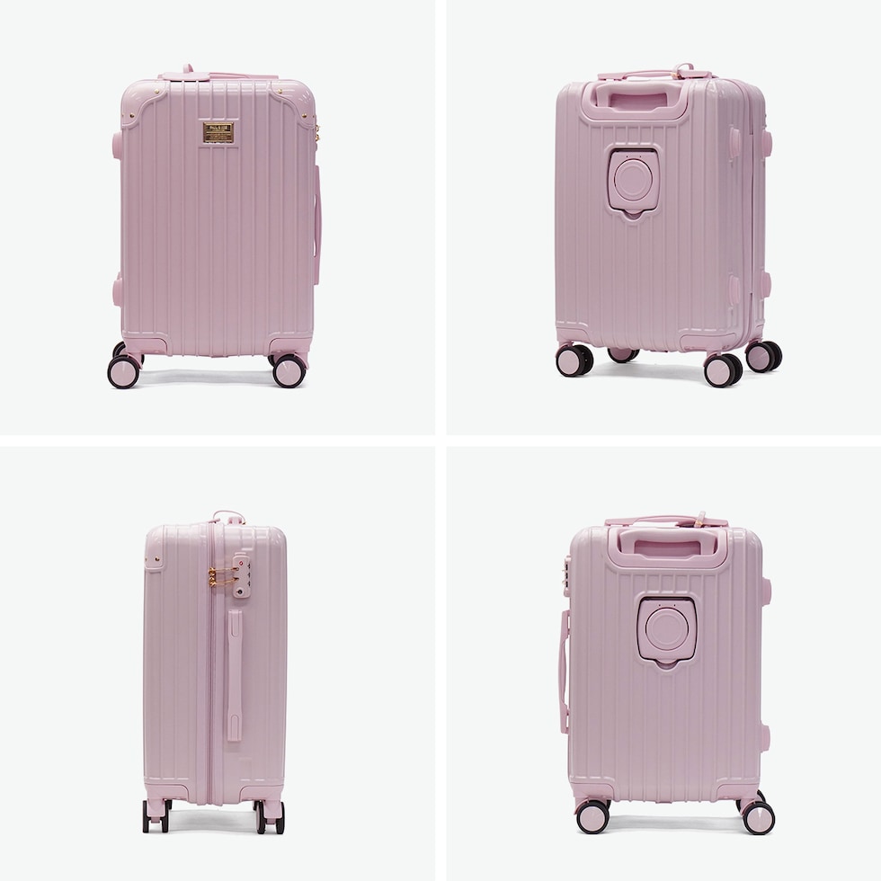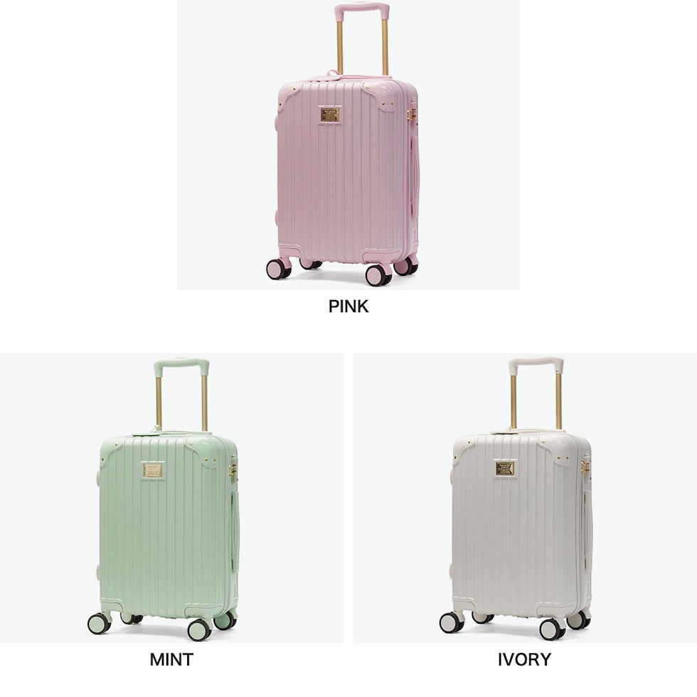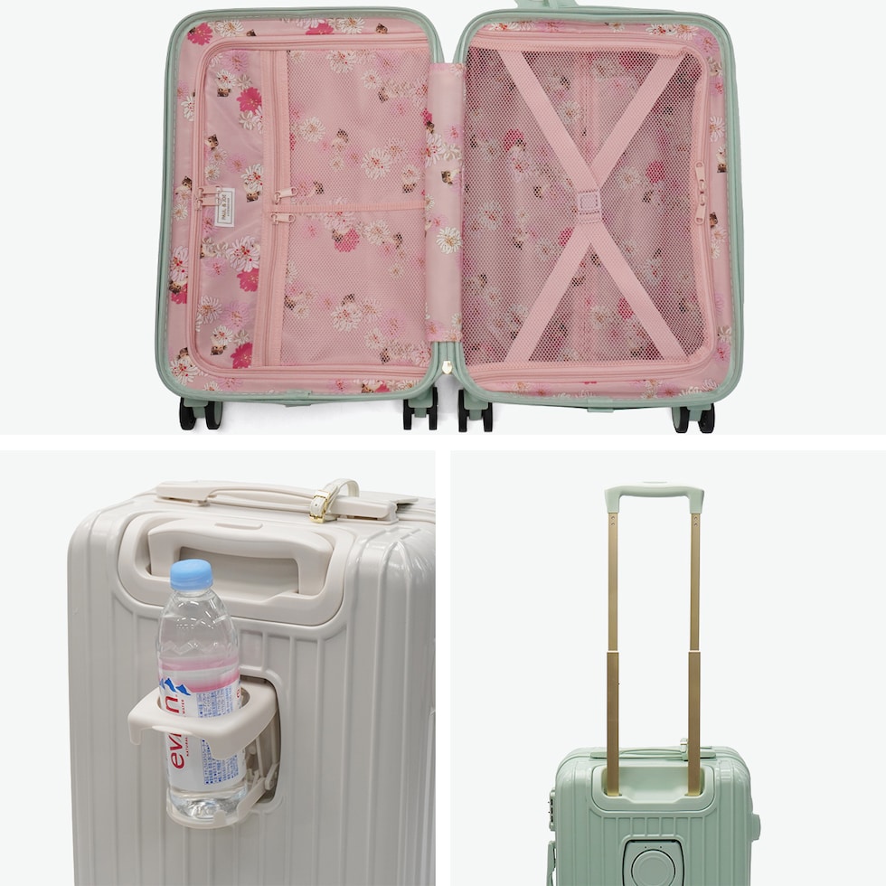 | 大人可愛い見た目と 華やかな内装にキュン! 淡いカラーが可愛いスーツケースです。ハンドルやタイヤも本体と同色で統一感のあるデザイン。表面は傷が目立ちにくいシボ加工仕上げで、上品な印象に。こちらは、機内持ち込み対応サイズです。内装にはヌネット&クリザンテームの総柄を採用し、華やかさも◎。着替えの収納に便利な同柄ポーチ付き。猫型ネームタグや折りたたみ式カップホルダーなど、機能性にもこだわった一品です。 |