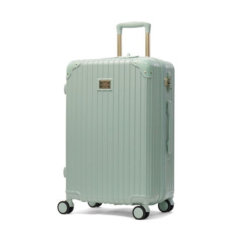 淡いカラーが可愛いスーツケースです。ハンドルやタイヤも本体と同色で統一感のあるデザイン。表面は傷が目立ちにくいシボ加工仕上げで、上品な印象に。こちらは、拡張可能な63~72L容量で荷物が増えても安心。内装にはヌネット&クリザンテームの総柄を採用し、華やかさも◎。着替えの収納に便利な同柄ポーチ付き。猫型ネームタグや折りたたみ式カップホルダーなど、機能性にもこだわった一品です。