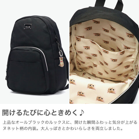 | 心ときめくデザインに 毎日が楽しくなる ヌネット総柄の裏地が可愛いリュック。軽量で通勤・通学はもちろん、デイリーにも使いやすいサイズ感です。取り外し可能なヌネットのメタルチャームがアクセントになり、シンプルながら遊び心をプラス。大人可愛いデザインで、毎日のコーデに馴染む万能アイテムです。 |