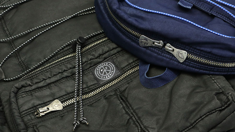 フライトジャケットに使われるナイロン糸で生地を織り、手間と時間のかかる後染めによる染色。独特な味わいを醸し出し、デニムのような色ムラやパッカリングが現す、ユーズド感のある表情が魅力です。また、加工の施されたパーツにもデザイン性の高さが現れています。