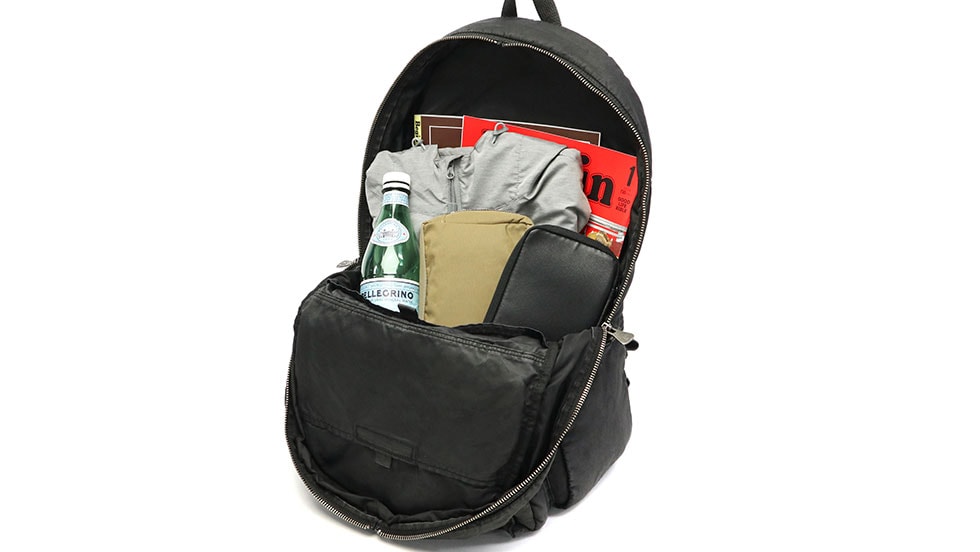 メインルームはB4サイズがちょうど収まり、貴重品に加えて雑誌やペットボトル、ポーチやちょっとした衣類など多めの荷物もしっかりカバーしてくれます。内外にポケットが充実しているので、小物が埋もれてしまうことなく、すっきりと収納できるのも魅力の一つです。