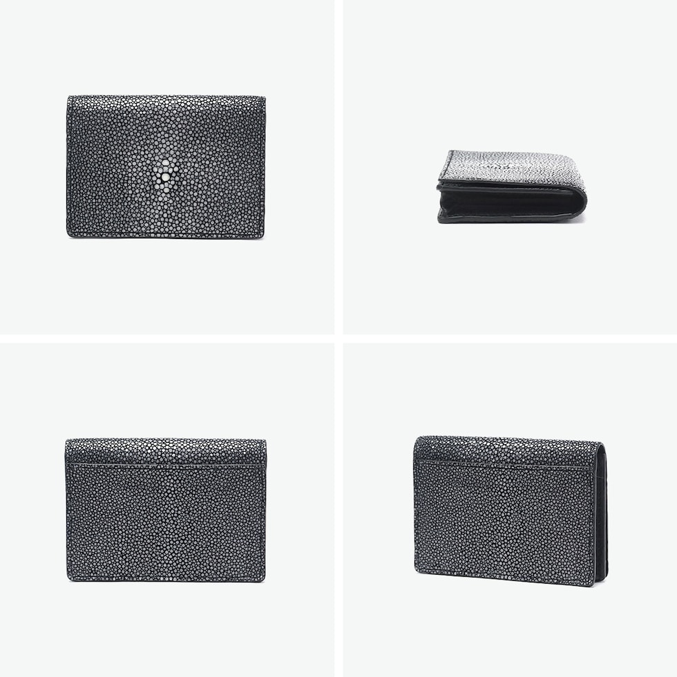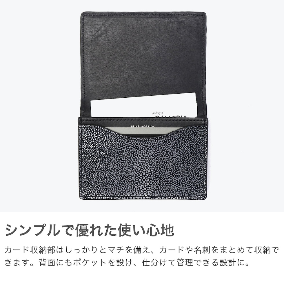 | 唯一無二の輝きを秘めた 上質なカードケース シンプルで使いやすく、コーディネートのひとつとして持てる小物シリーズ『Barca/バルカ』からスティングレイレザー(エイ革)を使用したカードケースが登場。古来より「海の宝石」や「ラッキーフィッシュ」などと呼ばれ、運気を上げるものとして考えられているスティングレイレザーは、非常に硬くて丈夫なためメンテナンスフリーで長くお使いいただける特徴を持っておりますが、その硬さゆえ針が通らず縫製が困難とされています。PELLE MORBIDA製品では裏側を丁寧にダイヤモンドカッターで削ることで、縫製を可能にし安心して長く使えるよう製作しました。 |