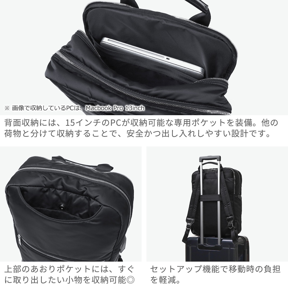 | 仕様 | <外側> ポケット×2 <内側> ポケット×3 PC収納×1 <付属品> 収納袋×1 |