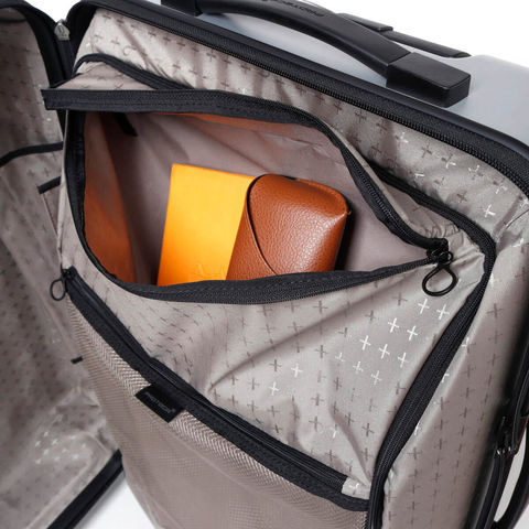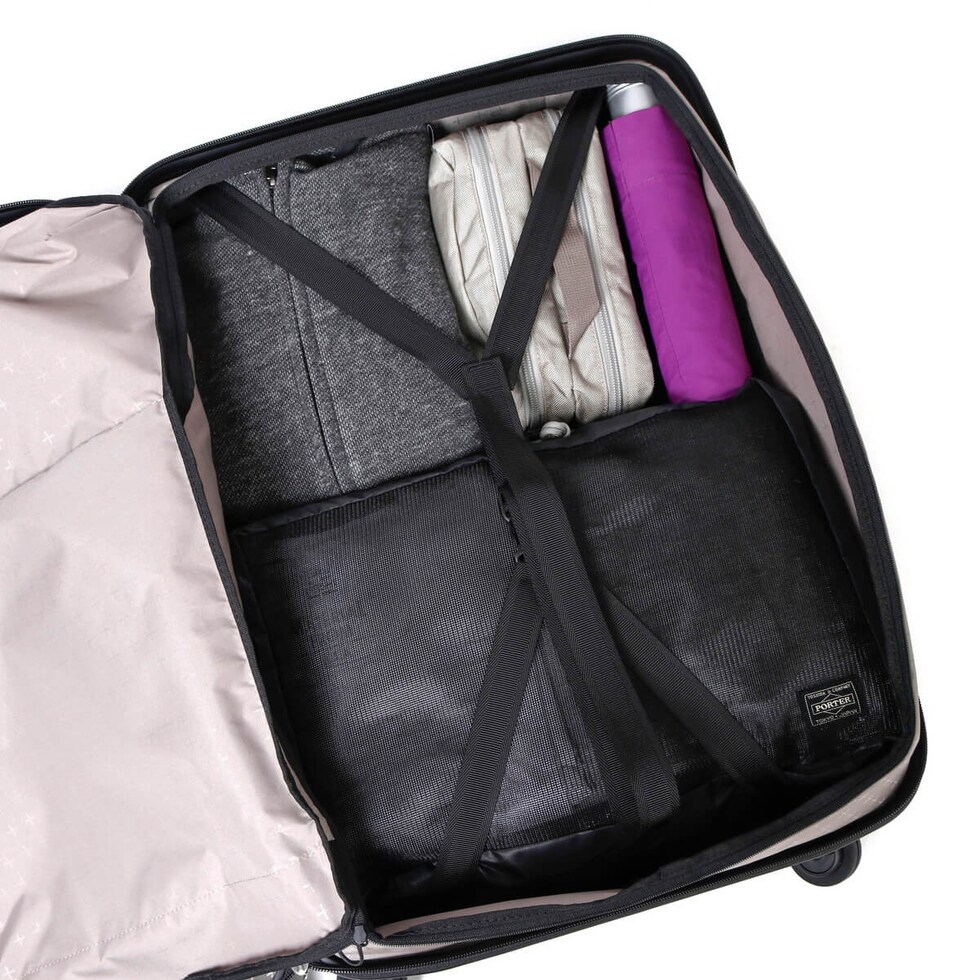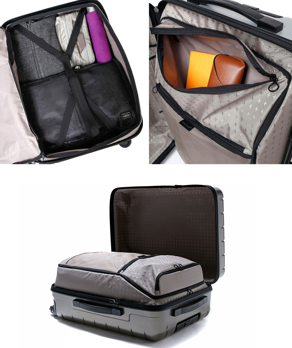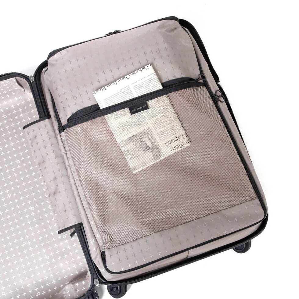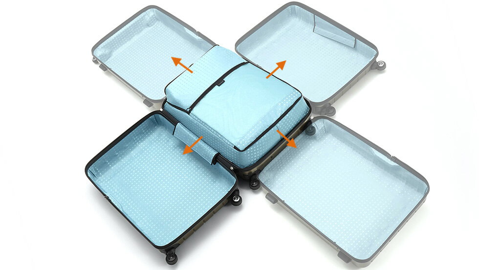 片面に荷物を集約して入れることで、ケースを閉める時に荷崩れしない画期的な収納スタイル。デッドスペースを少なくできるほか、整理のしやすさを格段にアップさせます。収納上部には、小物類を整理できる立体ポケットを装備。移動中や狭いスペースでも、タテ開きで出し入れできるレイアウトになっています。