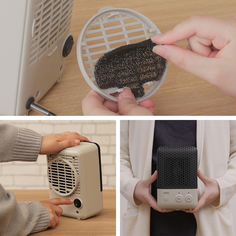 コンパクトヒーター 小さなボディと優しい丸みがかわいいミニヒーター。人感センサー機能やオートオフ機能も搭載した、安全・節約設計です。リラックスタイムからお仕事中まで、足元から身体を温めつつ、活性炭フィルターがホコリやニオイを吸着します。 |