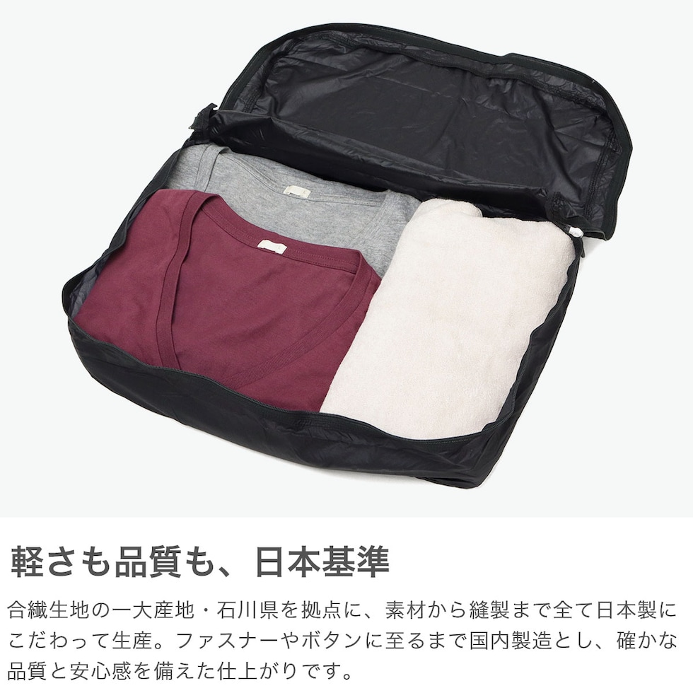 “気持ちまで軽くなる軽さ”をコンセプトにした、ファクトリーブランド『TO&FRO』と『PROTeCA』のコラボレーションアイテムです。透けるほど薄く、驚くほど軽いのに、丈夫で撥水性も備えたオーガナイザーシリーズ。こちらは薄手の衣類などの収納に最適な、Mサイズのトラベルポーチです。素材は徹底的に軽さにこだわり、世界最軽量を実現。ディテール部分まで日本製の丁寧なつくりがポイントです。旅行や出張にはもちろん、普段使いにも活躍する汎用性の高いアイテムになっています。