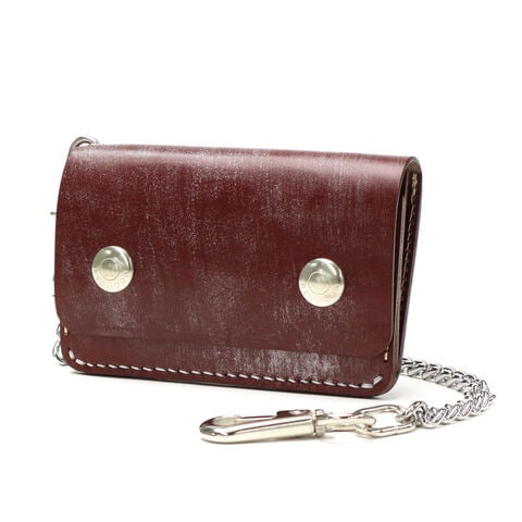 英国の老舗タンナー、トーマスウェア社のブライドルレザーを使用したトラッカーウォレット。「ブルーム」と呼ばれる表面に浮いたロウ成分が独特の雰囲気を醸し出しています。表面のロウは使い込むごとに馴染んで美しい光沢へと変わり、長くご愛用頂くことで表情の変化を楽しめます。