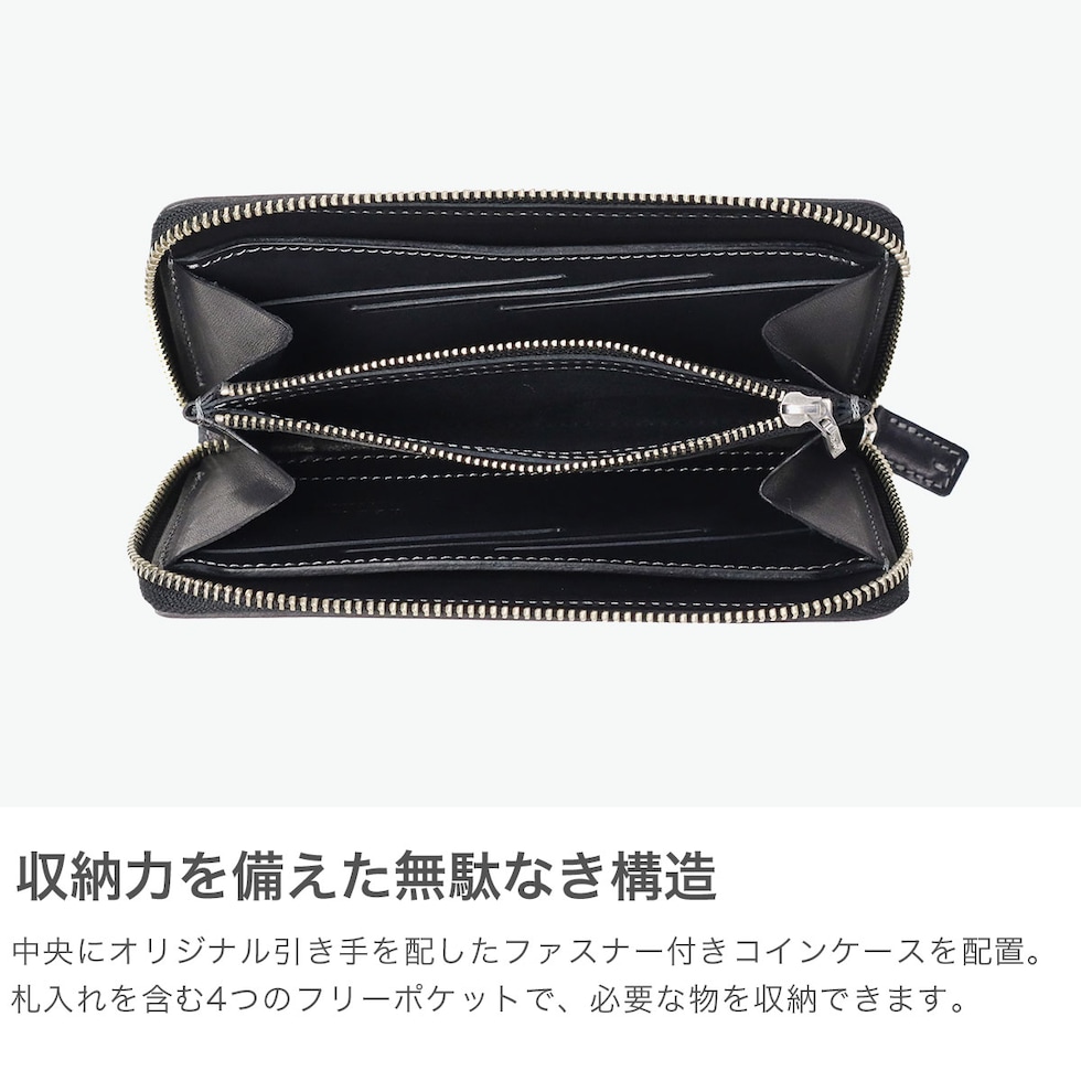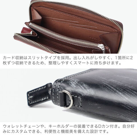 高級感漂う長財布 英国トーマスウェア&サンズ社のブライドルレザーを使用したラウンドファスナーロングウォレット。新仕様のカード収納はスリットタイプで、1箇所に2枚ずつ入れられスマートな出し入れが可能です。日常使いに十分な収納力を確保しつつ、無駄を省いたスマートなフォルムはビジネスにもカジュアルにも自然に馴染みます。上質な素材と洗練された機能美が融合した、大人のための上品な逸品です。 |