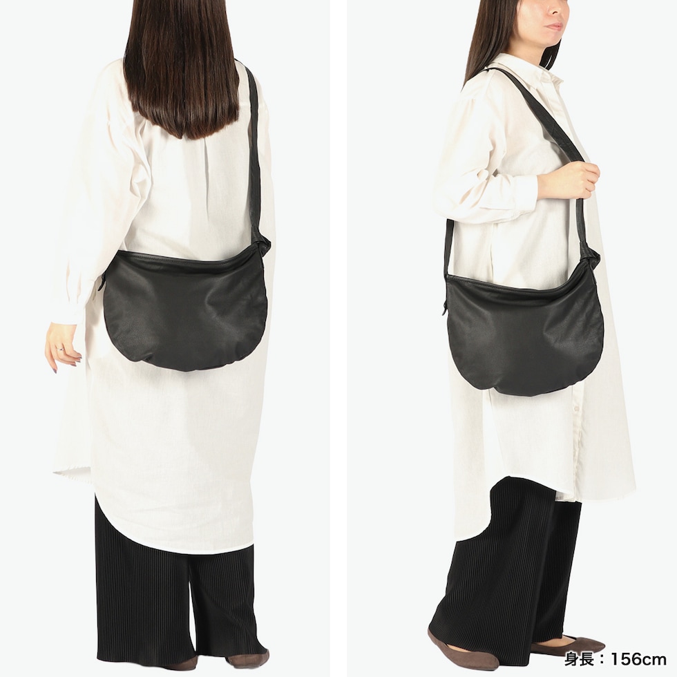 柔らかショルダー 『REN』の定番「2wayサークルショルダー」をブラッシュアップ。やぎ革のよさが引き立つよう、からだにくったりと沿うデザインで、日常使いに適した小ぶりのサイズ感になっています。荷物を入れるとぷくっと膨らむラウンドシルエットが特徴的。ショルダーストラップは、長さや結び方をカスタマイズできる仕様で、自分好みのデザインをお楽しみいただけます。 |