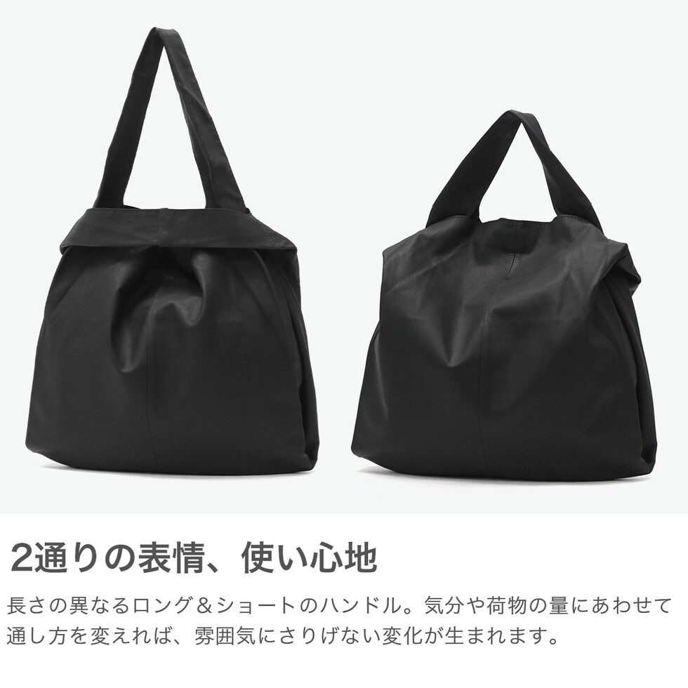 柔らかレザーバッグ くったりとした質感と自然な風合いにこだわり作られたRENオリジナルゴートレザー『BARE / ベアー』シリーズのトートバッグ。中でもこちらは、“レジ袋”から着想を得てつくられたバッグ「2wayレジブクロ」のMサイズ。ハンドルの通し方を変えれば、革の表情が引き立つ2通りのシルエットが楽しめます。 |