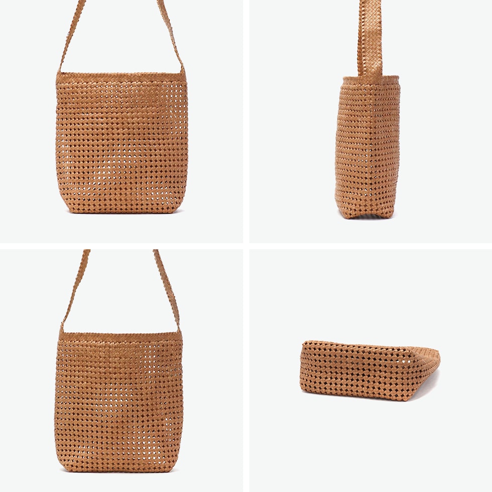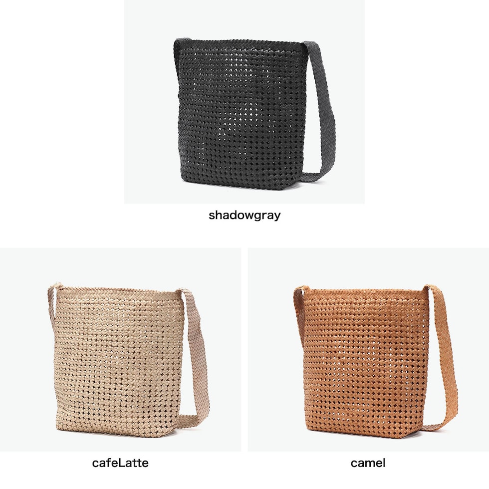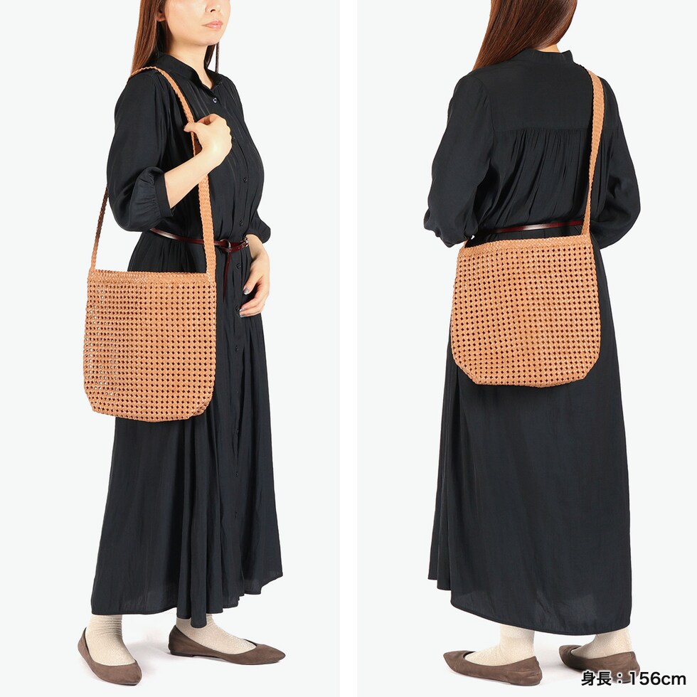 メッシュショルダー 美しい手編みの革の、程よい透け感が魅力的なメッシュショルダーバッグ。ストラップが長めのデザインになっており、結んで調節することで肩掛けのトートバッグとしてもお使いいただけます。肩への食い込みが軽減されるよう、平らなで幅広に設計されているところもポイントです。 |