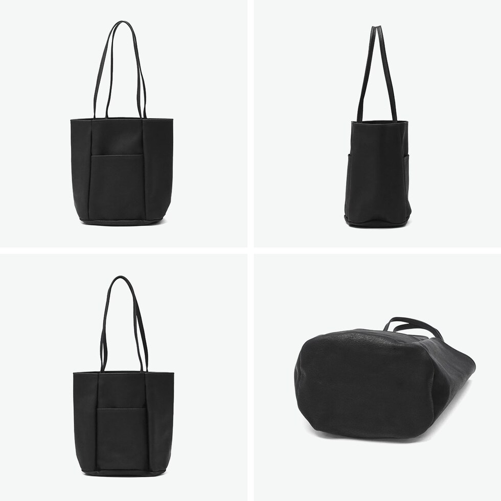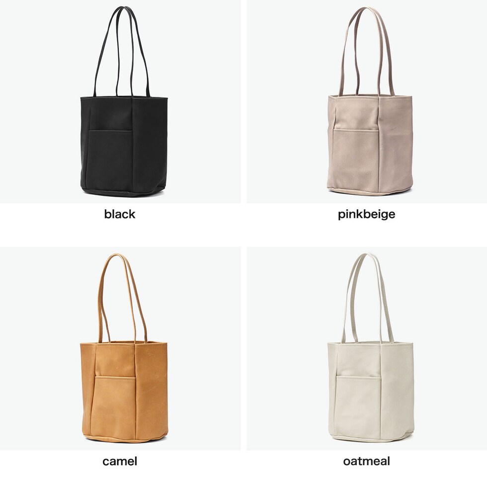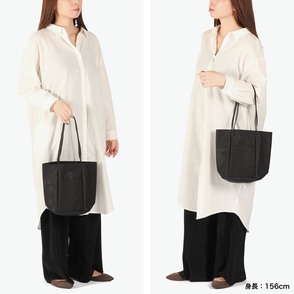 シンプルデザイン 華奢で長めのハンドルとすっきりとしたフォルムが印象的なバケットトート。縦型で深さがあるので、ファスナーがなくても安心して使用できます。バッグを肩に掛けたままスマートに荷物を出し入れできるのもポイント。コロンとした可愛らしい形ながら、底部は正円ではなく楕円にすることで、甘くなりすぎず清潔感のあるスマートさをキープしています。 |