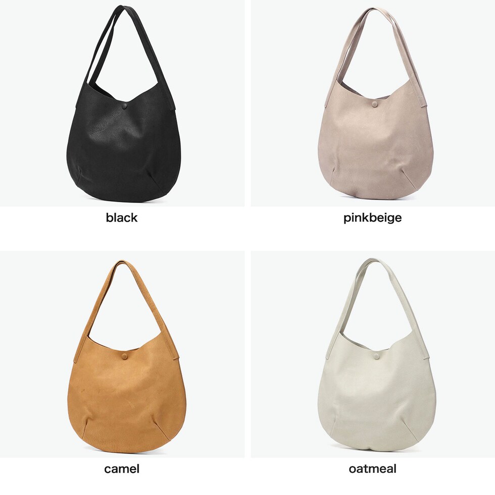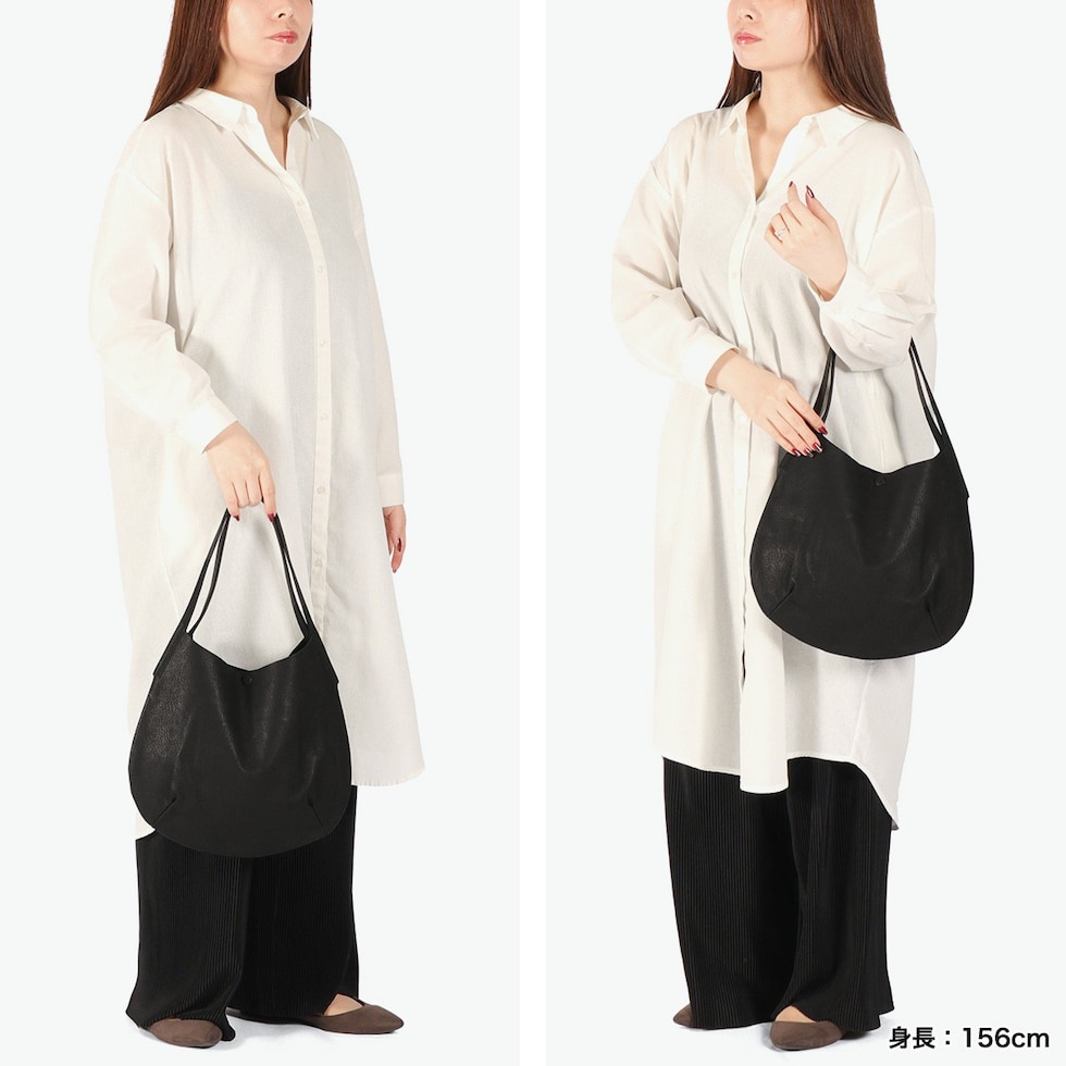 ドロップフォルムが魅力 最低限の荷物を持ち歩くのにちょうどよく、あえて“控えめに持つ”というエレガントな気持ちに寄り添う「サークルトート」。切りっぱなしの一枚革を使うことで生まれる、工業製品のようなぺたんとした平たいルックスが特徴です。マチのない構造ながら、カーブのある部分にゆとりをもたせることで、荷物を入れた際には自然と立体的なフォルムへと変化します。 |