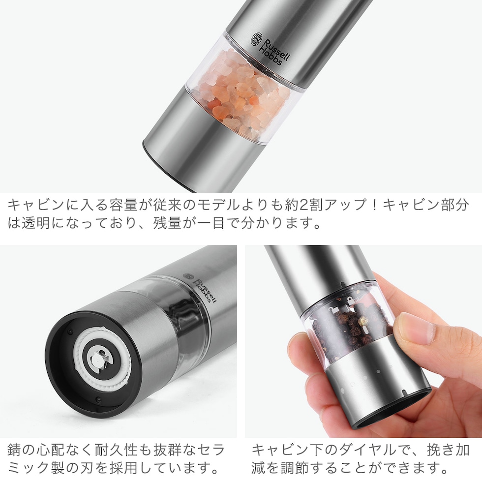 【正規品1年保証】 ラッセルホブス 電動ミル ソルト ペッパー 電池式 電池 小さい Russell Hobbs ミル ミニ ミニサイズ スタンド ギフト プレゼント 岩塩 胡椒 2本 2本セット おしゃれ ソルト&ペッパー 7935JP