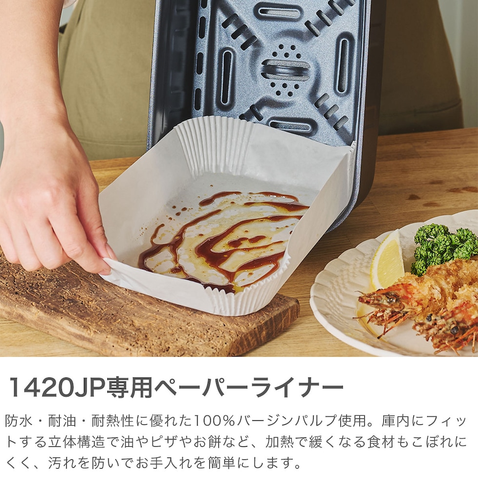 専用ペーパーライナー 別売りのエアフライオーブン(1420JP)専用のペーパーライナー。防水性、耐油性、耐熱性の100%バージンパルプ素材で、庫内にフィットする立体構造で、油はもちろん、ピザやお餅など、加熱で緩くなる食材もこぼれなくなるので便利。また、ご使用いただくことで庫内が汚れにくくなり、丸洗いの回数も減るので、使用後のお手入れが格段にラクになるアイテム。食品の風味に影響を与えにくく、安心してご利用いただけるのもポイントです。 |