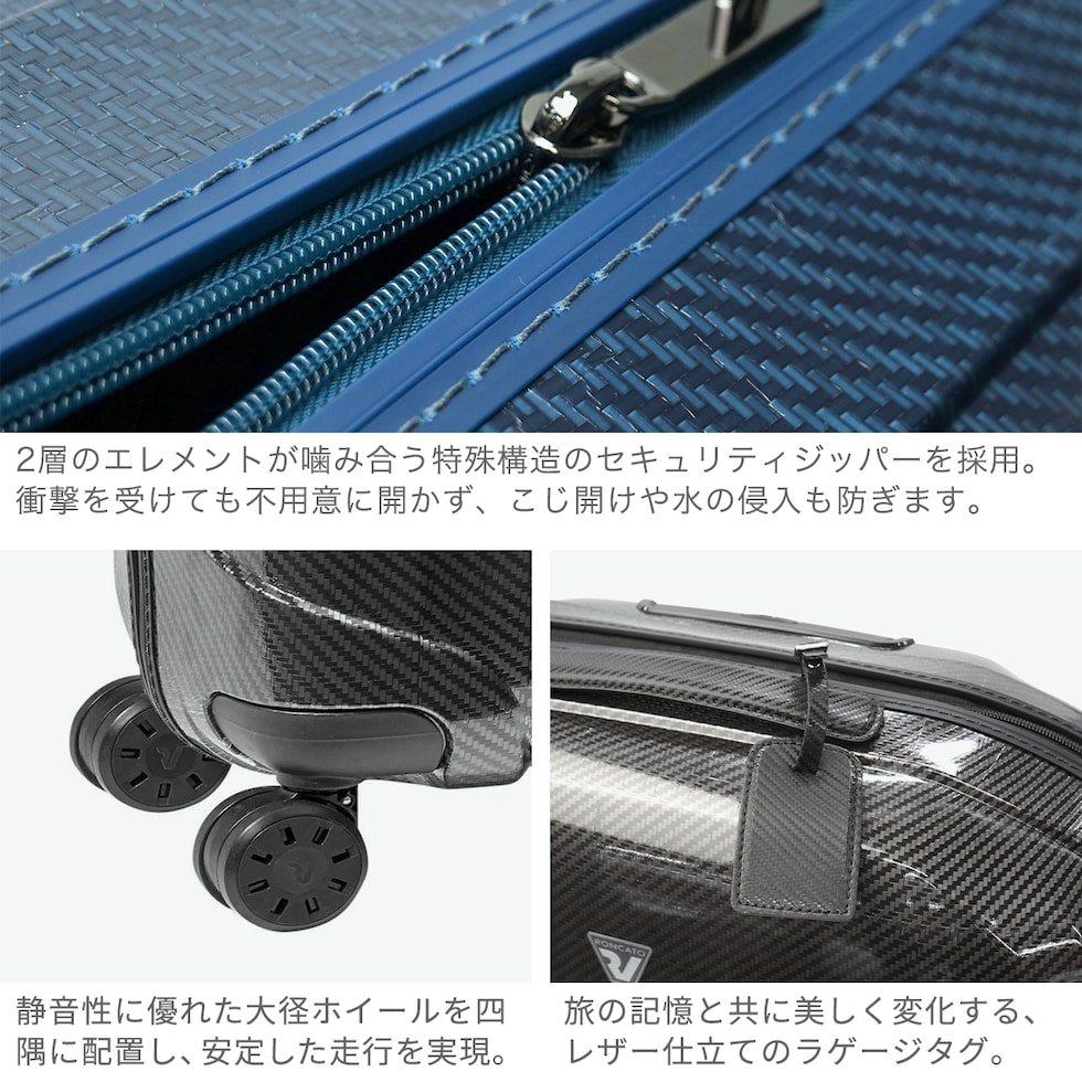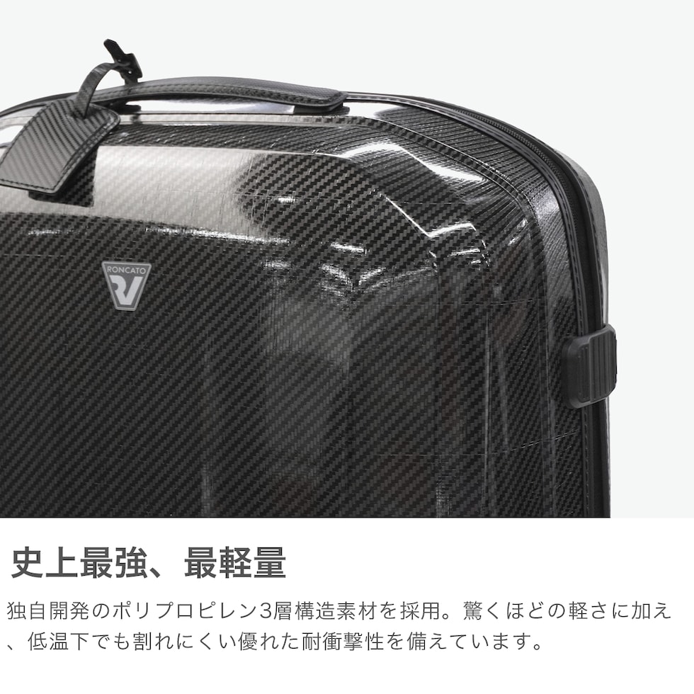 | 旅をもっと自由にする 超軽量スーツケース RONCATO史上最も軽く耐久性に優れた「WE ARE」コレクションの、容量92Lのスーツケース。BMWやフォルクスワーゲンのデザインにも携わった工業デザイナーLamberto Angelini氏のデザインを纏ったシェルは美しく機能的です。2層のエレメントがしっかり噛み合う特殊構造のジッパーで、セキュリティ性も抜群。本体には、旅の記憶と共に美しく経年変化するレザー製ネームタグを付属しています。 |