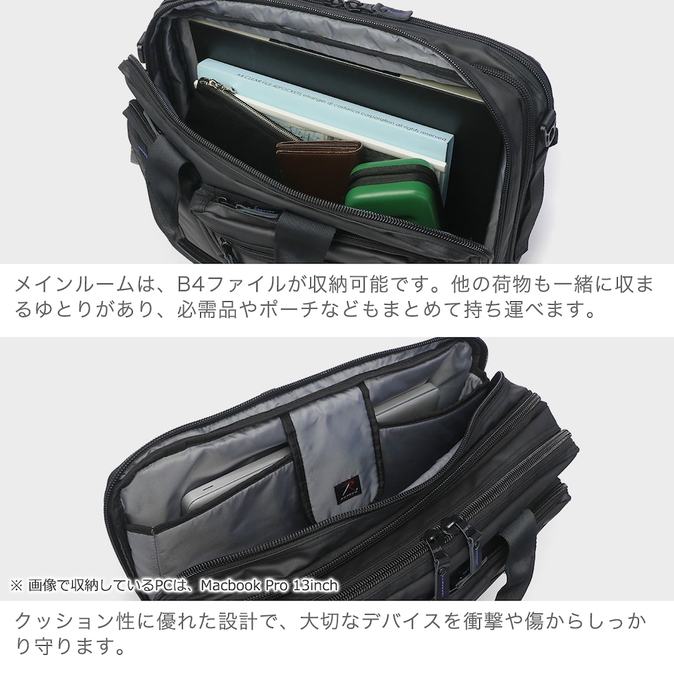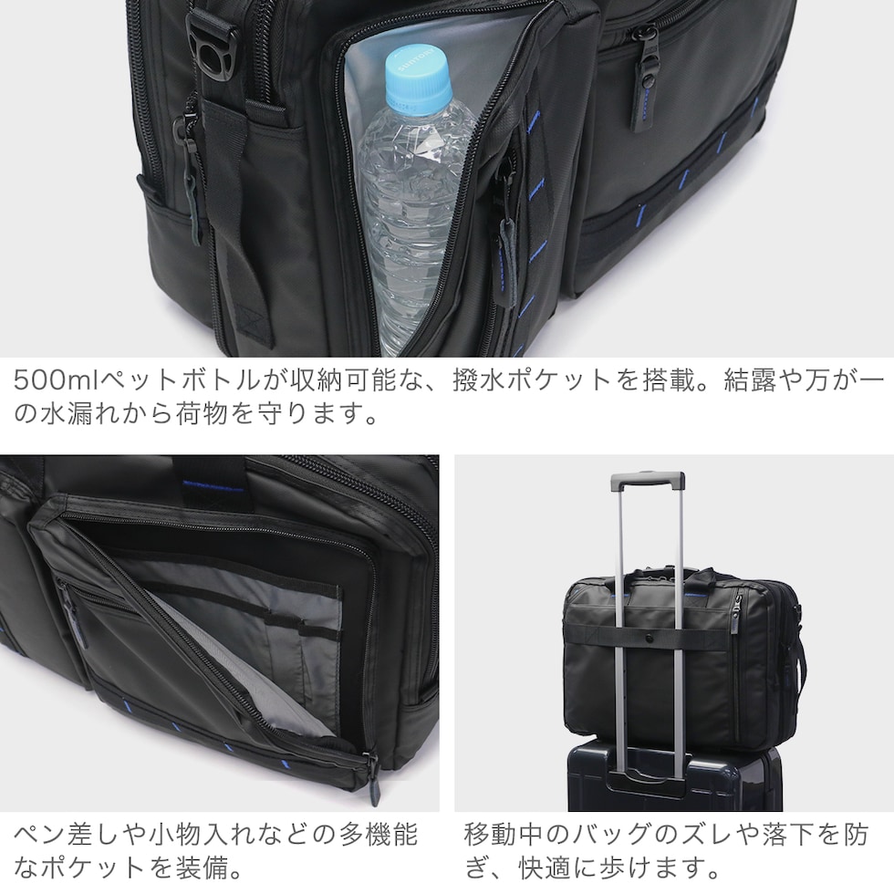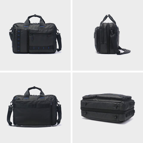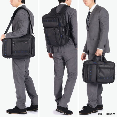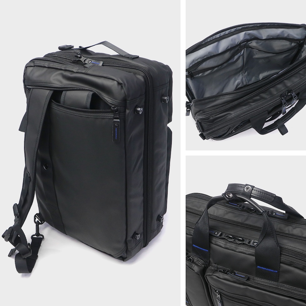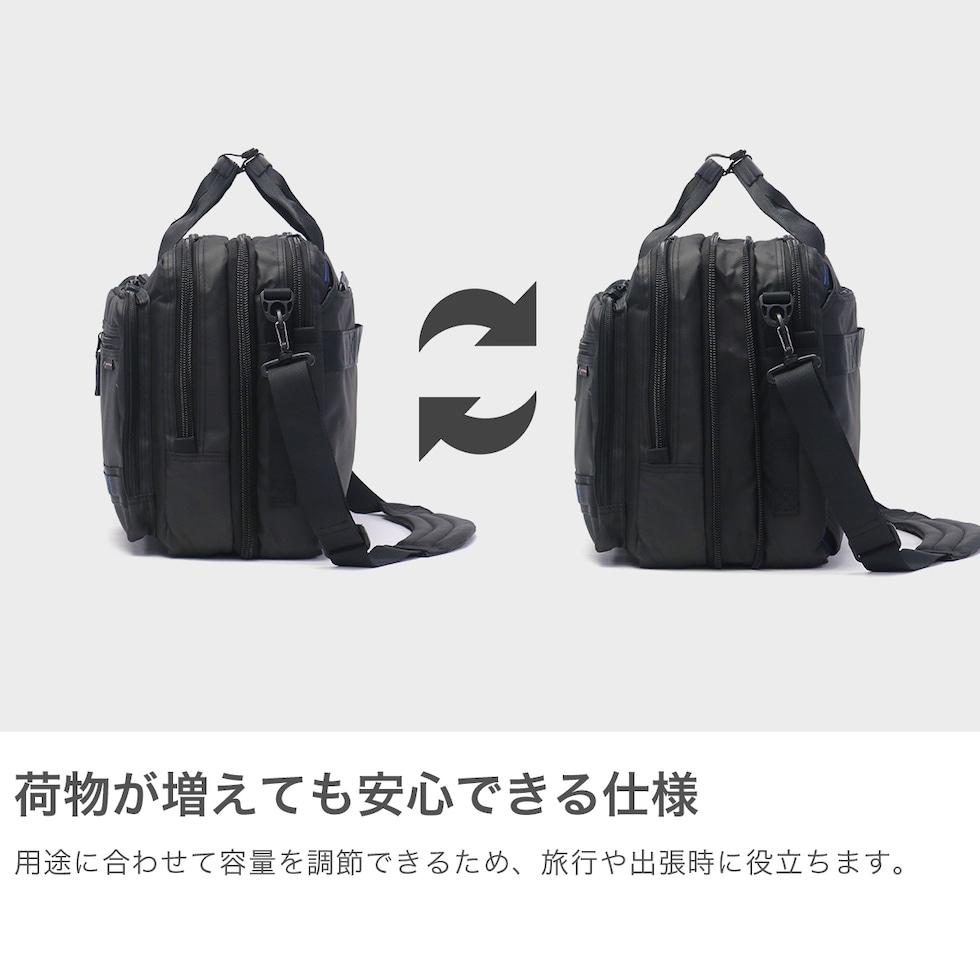 | 3WAY仕様で 多様なシーンに 手持ち・肩掛け・リュック対応で多用な持ち方ができる、3WAYブリーフケース。A4・B4や16インチPC対応の大容量で、拡張機能も搭載しています。また撥水加工や底鋲付きで実用性も抜群。通勤や出張に最適な一品です。 |