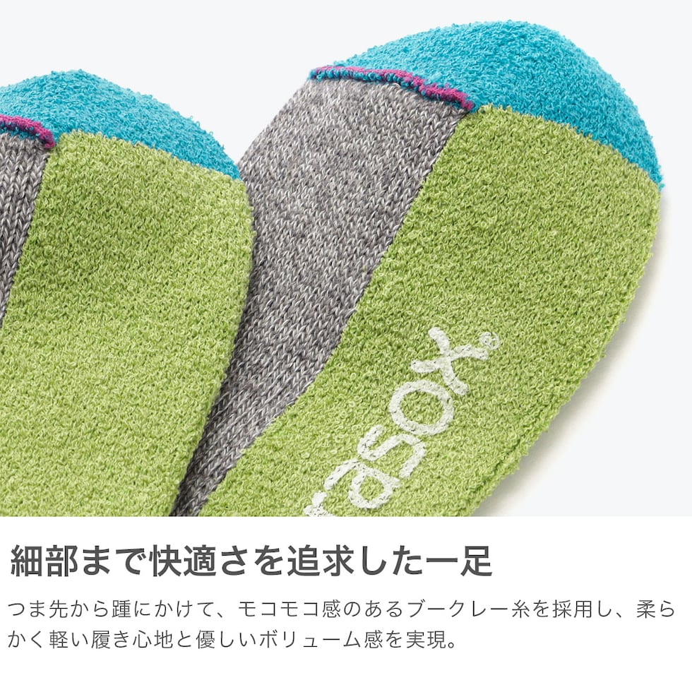 快適さを追求した一足 動きやすさを追求したアンクル丈ソックス。足の形状に合わせて踵部分を深く編み込んでいるので、足裏面を引き伸ばさずズレを抑えています。また、つま先部分の縫いあわせを表側にすることで、歩行時のゴロつき感をなくし快適さをキープ。底はパイル調の仕様で 衝撃を吸収し、足底をやさしく包み込んでくれます。ウォーキングや体を動かす際にもおすすめです。 |