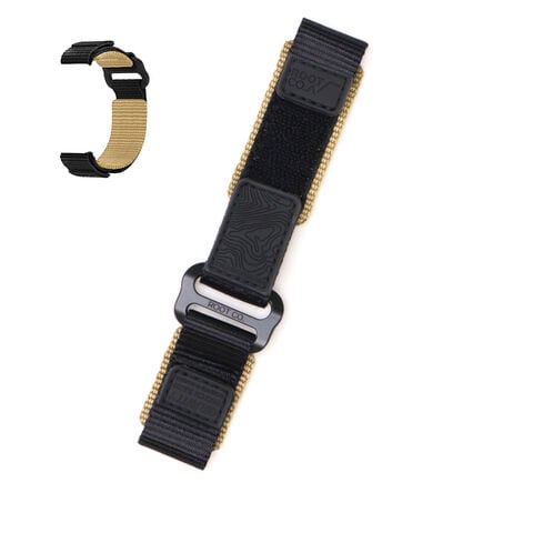 耐久性のあるナイロンウェビングを採用し、アウトドアの様々なフィールドでタフに使えるApple Watch用バンド。ベルクロ式なのでワンタッチの着脱やサイズ調節が可能です。デザインは、アウトドアシーンに合わせやすいラフすぎないカジュアルな仕上がりで、バンド端に湿気や摩耗に強いPVC製タグを配置する等、細かいディテールにもこだわっています。
