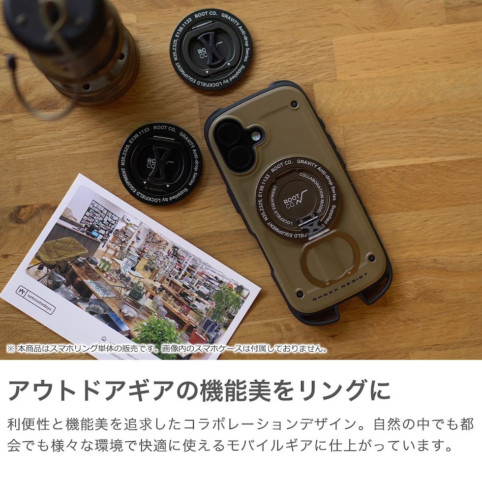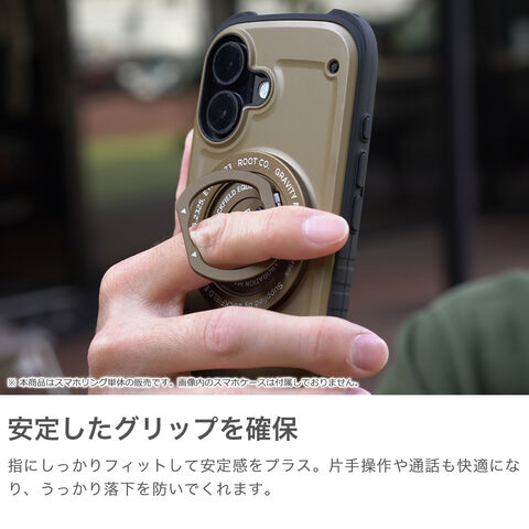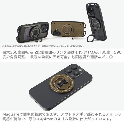 活動的な毎日をサポート 「スマホリング」としての便利さと「スマホスタンド」としての実用性を兼ね備えた、Magsafe対応のマグネット式スマホリングスタンドです。『LOCKFIELD EQUIPMENT』のとコラボレーション限定デザイン。MagSafe非対応機種・ケースに使用する場合はマグネットリング等を使うことで装着可能。好きな角度や向きに調整でき、スリム設計で日常やアクティビティをより快適にサポートしてくれます。 |
