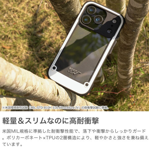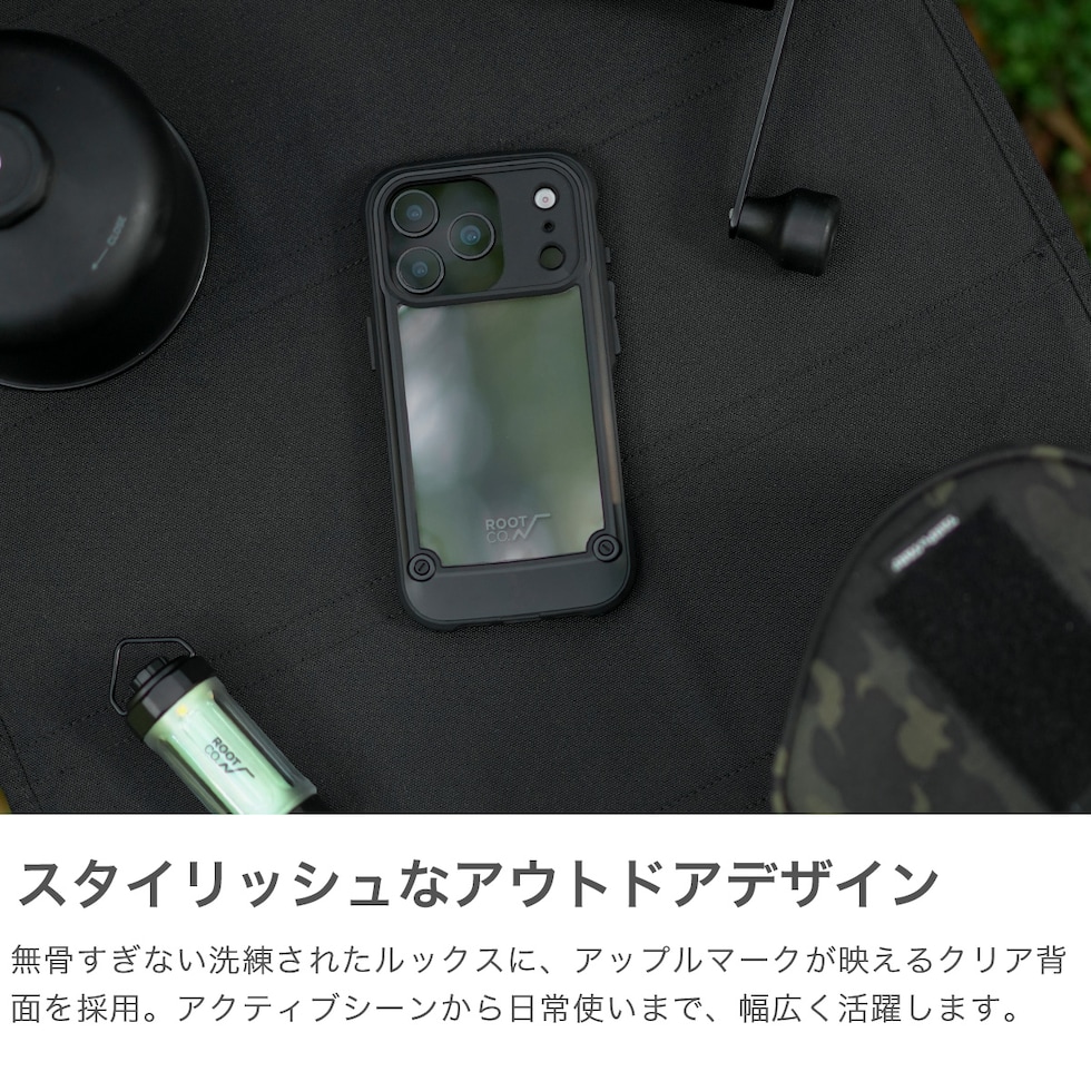 機能性とその存在感 登山やキャンプ・BBQなどアクティブなシーンで幅広く活躍できる、機能・耐衝撃・デザインの3点を兼ね備えたアウトドアテイストのiPhone17Pro専用ケース。軽量&スリムをキープした衝撃吸収力に優れ、背面にはクリアパネルを採用したiPhone本体のデザインを活かすデザインとなっています。 |
