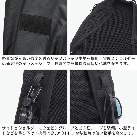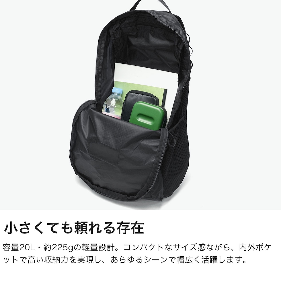 パッカブルリュック 耐久性の高いリップストップ生地を採用した軽量バックパック。20Lの少しコンパクトなサイズ感ながら、機能的なギミックを備えています。折りたたんで収納できるパッカブル仕様でサブバッグとしても便利。背面とショルダーストラップには通気性の良いメッシュ素材を使用し、蒸れを軽減し長時間の仕様でも快適な背負い心地。旅行やアウトドア、日常使いまで幅広いシーンで活躍してくれるアイテムです。 |