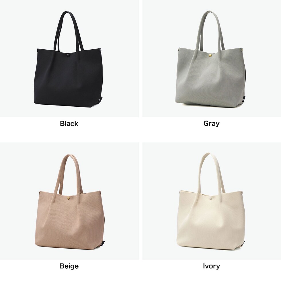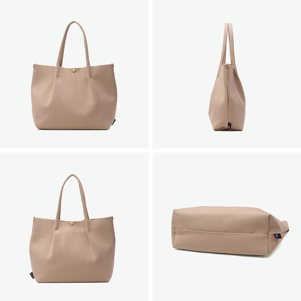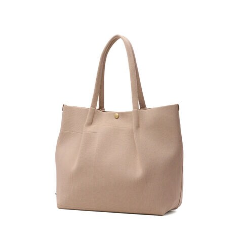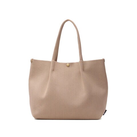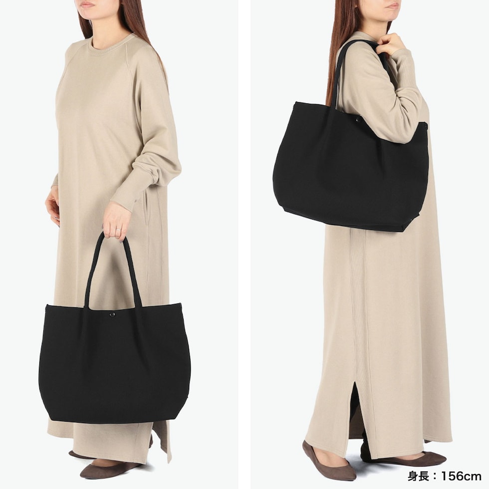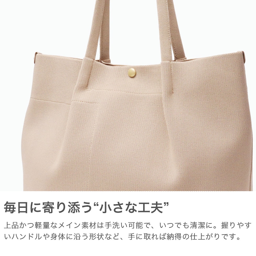 柔らか素材のトート パターンにあわせパーツごとに生地を編み立てることで、製造時の端材を出さずに素材をフル活用したトートバッグ。サラリとした手触りは暑い季節にもベタつかず、快適。ニットながらハリがあり、荷物が少ない時にも型崩れしにくく自立するのも魅力です。書類や仕事のアイテムをざっくり入れても安心の大きめサイズに仕上げました。 |