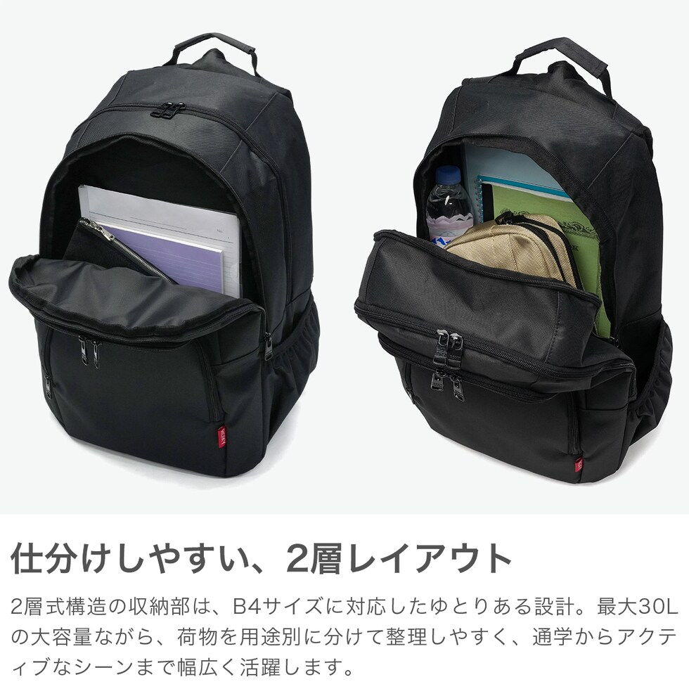 | 通学も部活も 毎日にちょうどいい 存在感のある刺繍ロゴワッペンがポイントの『GO OUT』シリーズのバックパック。2層構造で荷物をすっきり整理でき、A4・B4サイズの収納に対応します。30Lの大容量ながら軽量設計で、通学や部活、旅行まで幅広いシーンで活躍。撥水加工を施したポリエステル素材を使用し、急な雨にも安心です。 |