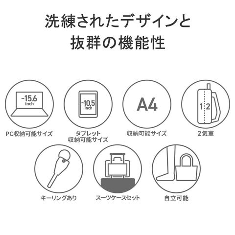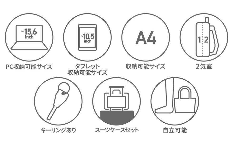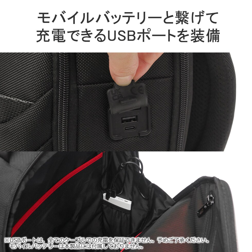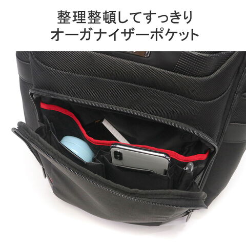 | 仕様 | <外側> ジップポケット(M)×1 └ 内蔵 ベルクロポケット(M)×1 ジップポケット(M)×1 ポケット(XS)×2 ジップポケット(M)×1 └ 内蔵 キーフック×1 ジップポケット(M)×1 ジップポケット(S)×2 ジップポケット(XS)×1 USBポート(Type-A)×1 USBポート(Type-C)×1 <前面収納> PC収納×1 メッシュジップポケット(M)×1 メッシュポケット(XS)×2 ポケット(XS)×2 USBケーブル×1 └装備 Type-A端子×1 Type-C端子×1 <背面収納> PC収納×1 タブレット収納×1 |