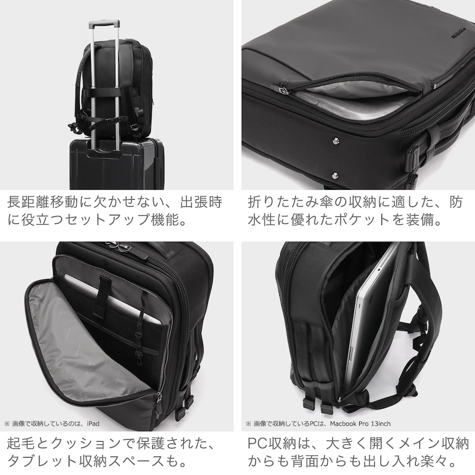 | ビジネスパーソンの為の 多機能2WAYリュック 飛行機で世界中を飛び回るジェットセッターに向けたコレクション"Jet biz"シリーズより『Jet biz 3 / ジェットビズ 3』が登場。B4サイズ対応で、15インチPCやタブレットを収納可能。エキスパンダブル機能での容量拡張やスーツケース連結は、ビジネスシーンに活躍します。 |