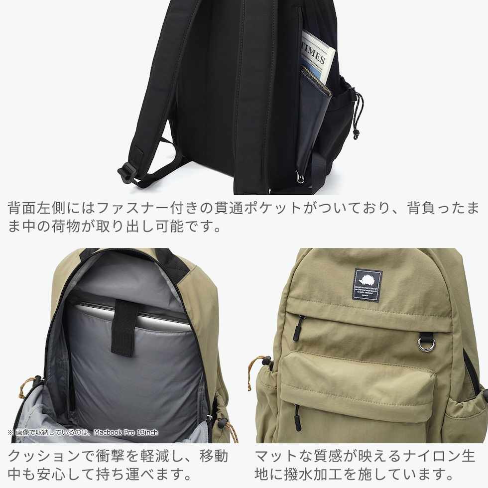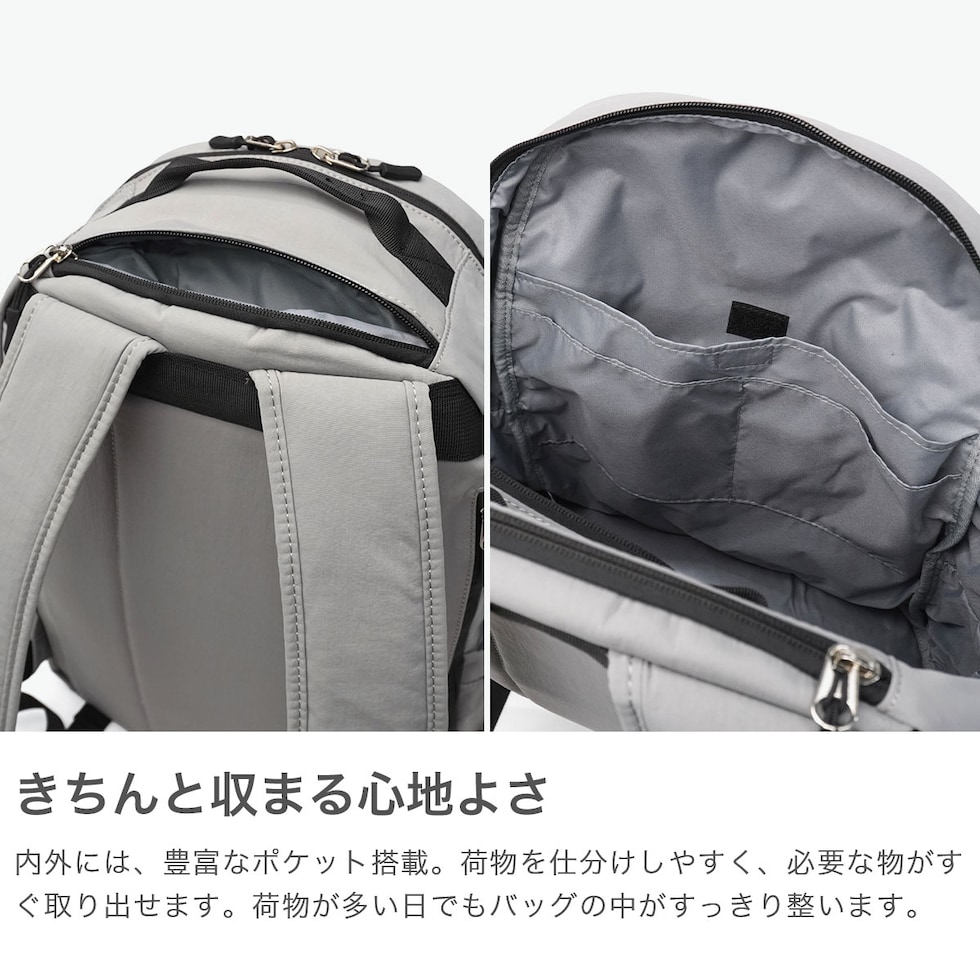 | どんな予定や装いにも フィットするデザイン 光沢を抑えた上質なナイロン素材を使用し、フォーマルにもカジュアルにもなじむデザインを追求した『Stan Series』のデイパック。大容量ながらすっきりとした印象で、通勤・通学から1泊程度の旅行まで幅広く対応します。多収納ポケットで整理しやすく、撥水加工により天候を気にせず使用可能。シンプルで洗練されたデザインは、きれいめから大人カジュアルまで幅広く活躍するアイテムです。 |