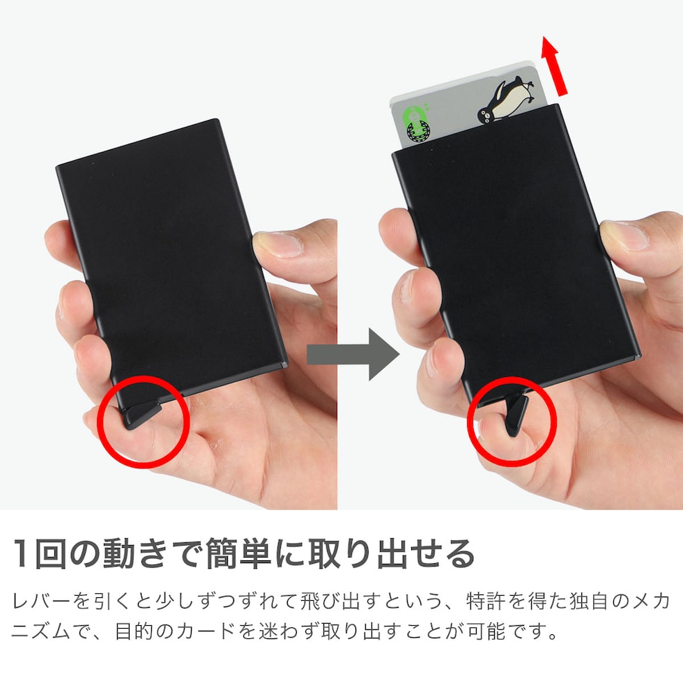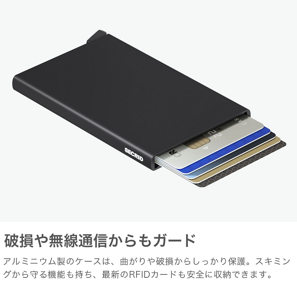 SECRIDの中で最もミニマルかつ高い人気を誇るカードプロテクター。特許取得のメカニズムにより、レバー操作でカードが整列しながらスライドするスムーズな操作感が魅力です。アルミ製ケースはカードの曲がりや破損を防ぐだけでなく、スキミング対策にも対応。最大4枚のエンボスカード、または6枚のフラットカードに対応し、必要最小限をスマートに持ち歩ける、キャッシュレス時代に最適なミニマルウォレットです。