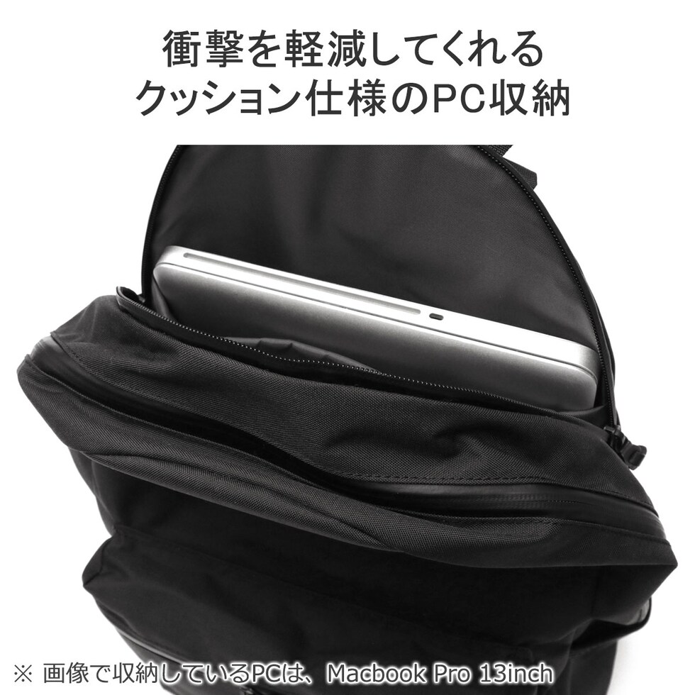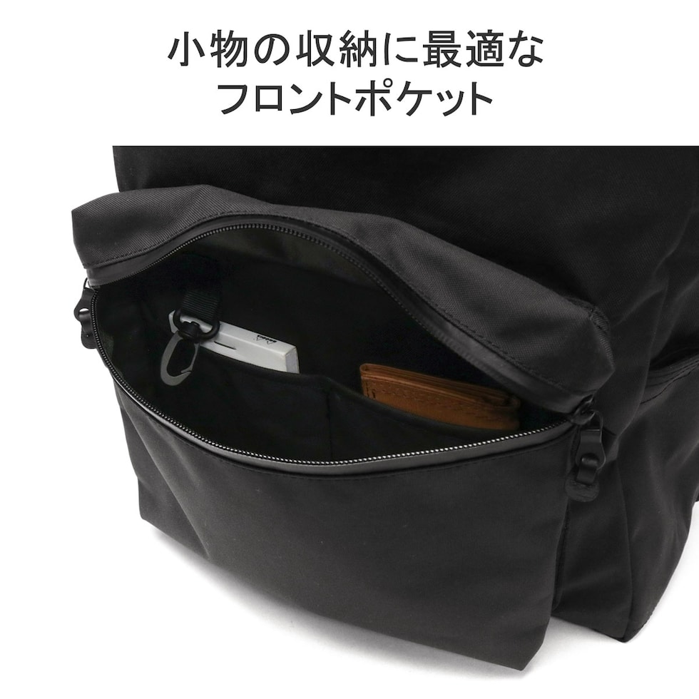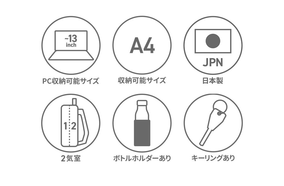 | 仕様 | <外側> ジップポケット(M)×1 └ 内蔵 ポケット(XS)×2 キーフック×1 ベルクロポケット(S)×1 ポケット(S)×1 <前面収納> ボトルホルダー×2 <背面収納> PC収納×1 |