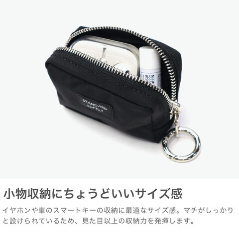 可愛さと実用性を実現 無駄を削ぎ落としたミニマルデザインに、上質な素材感がマッチした『STANDARD SUPPLY』のスクエアチャームポーチ。マチがあり、車のスマートキーや家の鍵などを入れるのにちょうど良いサイズ。丸型カラビナ付きで、ストラップを付けたり、リングにかけたり色々な使い方ができます。 |