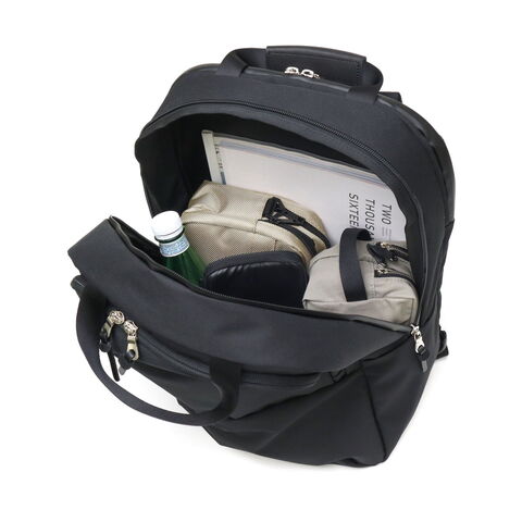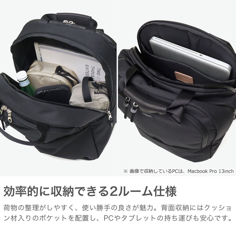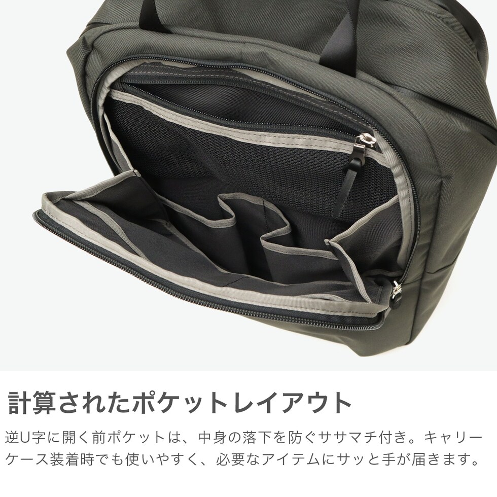 快適バックパック カジュアルさを持ち合わせたビジネスユースシリーズ『EFFECT』のキャリーパック。キャリーケースに付けた状態での使用を想定したポケットレイアウトになっており、カッチリしすぎないカジュアル感と優れた機能性から、ビジネスと普段使いの両立ができるアイテムです。 |
