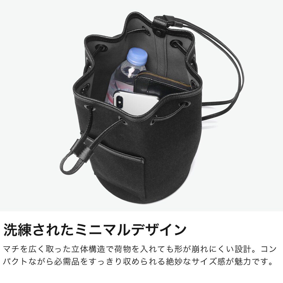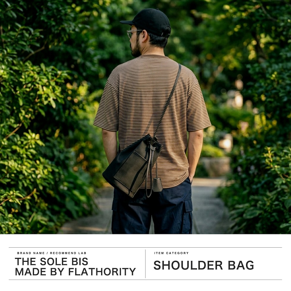 時代性にそった最高のクオリティーを追求し、さまざまなアイテムを展開するブランド「THE SOLE」と、日本の老舗バッグブランド「Flathority」とのコラボレーションライン『THE SOLE bis made by Flathority』。こちらは福島ティアモ雄介氏が完全監修した3WAYショルダーバッグです。肩掛け・斜め掛け・手持ちの3スタイルに対応し、継ぎ目のない一本仕上げのレザーストラップが美しい佇まいを演出。軽量で耐久性に優れた撥水生地を採用し、都市生活に必要な機能をミニマルにまとめました。スマートフォンやミニ財布、鍵、文庫本などが収まる絶妙なサイズ感で、休日のお出かけやちょっとした外出にも活躍する巾着型ミニバッグです。