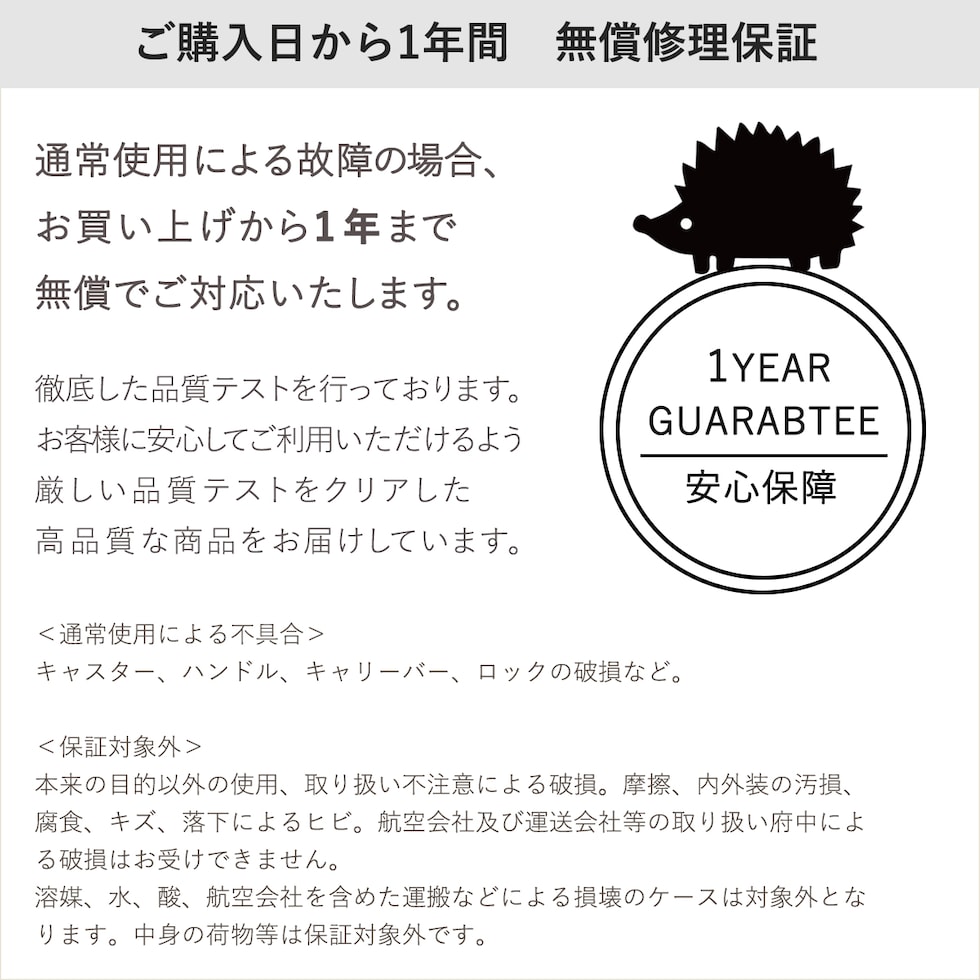 | <購入前にご確認ください> ・メーカーの意向により、付属品の収納袋や箱、製品の仕様やデザインは予告なく変更となる場合がございます。 ・下記による返品・交換はお受けすることができませんので、予めご了承ください。 └ 製品の性質上による細かいキズや塗装ムラ、気泡などがある場合。 └ 配送用の段ボールにキズ、汚れ、破損がある場合。 ・エキスパンダブル機能付きの製品は、マチ拡張時の3辺の和が機内持ち込みサイズ、預け入れ無料サイズを超える場合がございます。また、航空会社や飛行機の機種などによって規定が異なりますので、予めご確認の上お求めください。 ※機内持ち込みサイズ目安表はこちら ・摩擦・水濡れ・日焼けなどにより、色落ち・色褪せが生じる場合があります。 また、製品と衣類の接触により、相互に色移りする場合がございます。 ・柄の位置やカラーバランスなどは、生地の裁断や製造過程、素材の特性により画像とは異なる場合がございます。商品をお選びすることはできませんので、予めご了承ください。 ・極力実物に近い色味を再現しておりますが、モニター等の条件により画面上と実物では色味が異なって見える場合がございます。 |