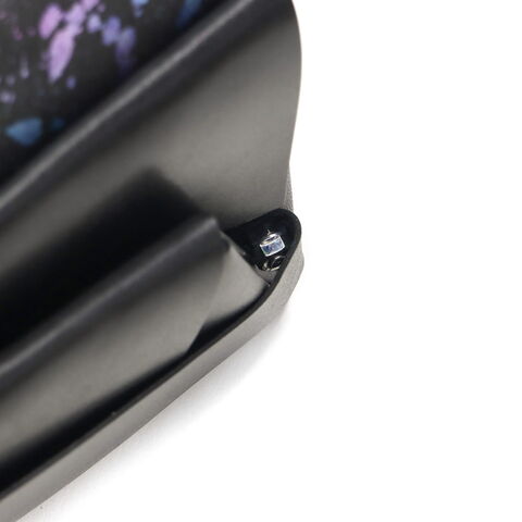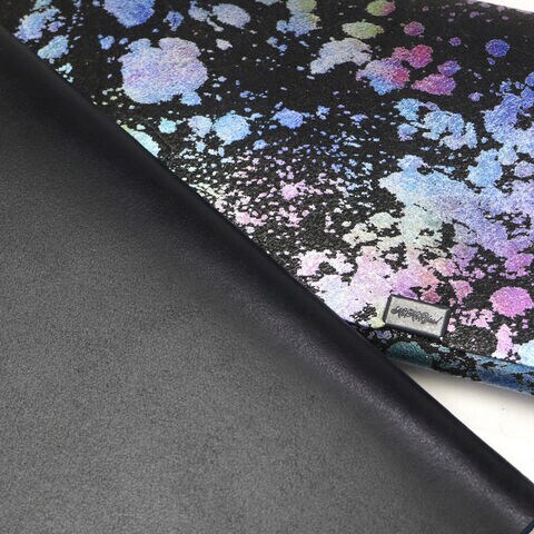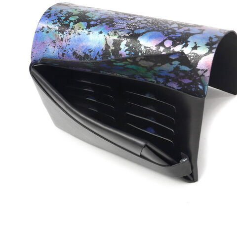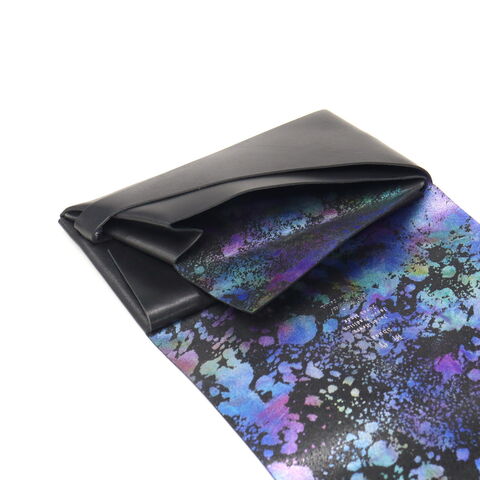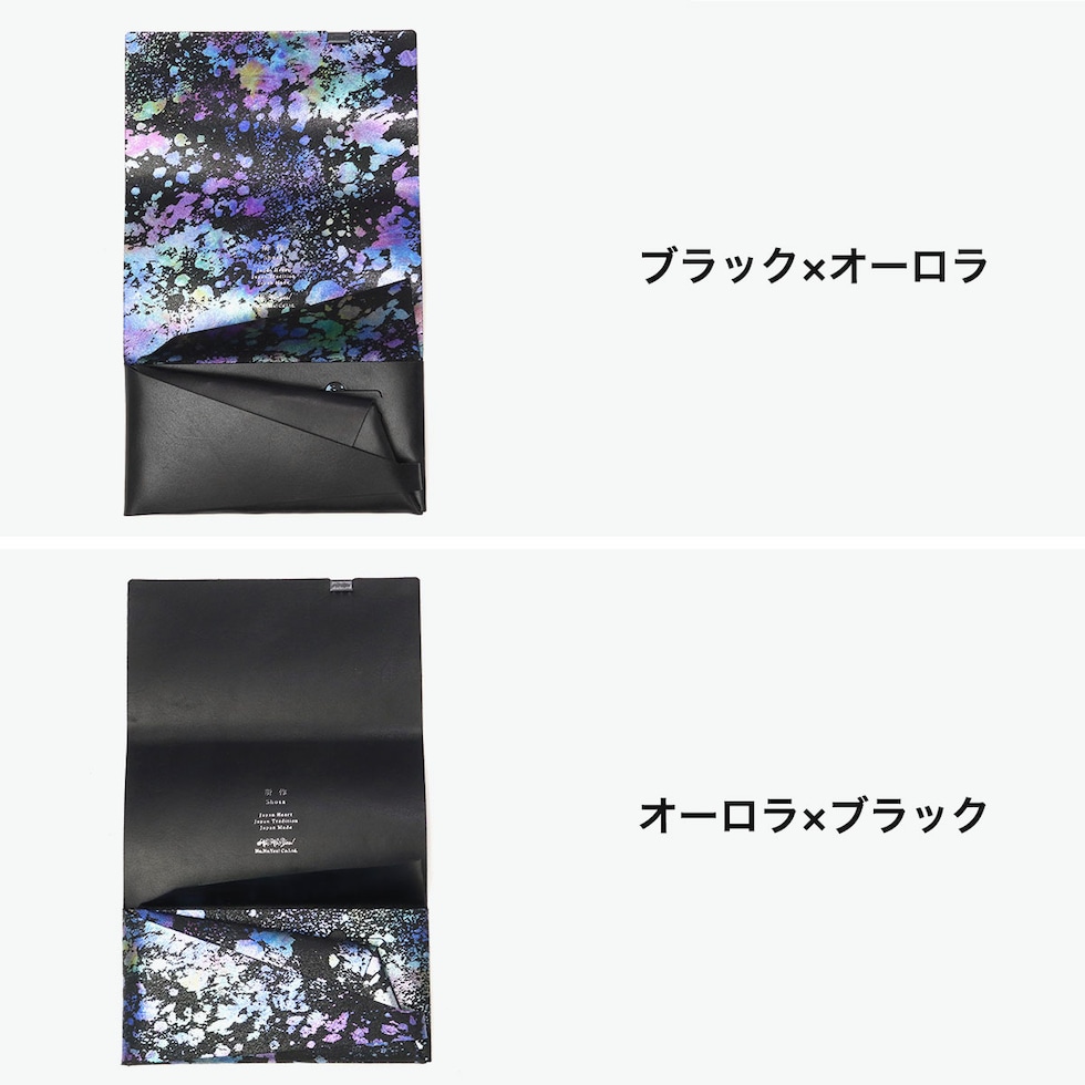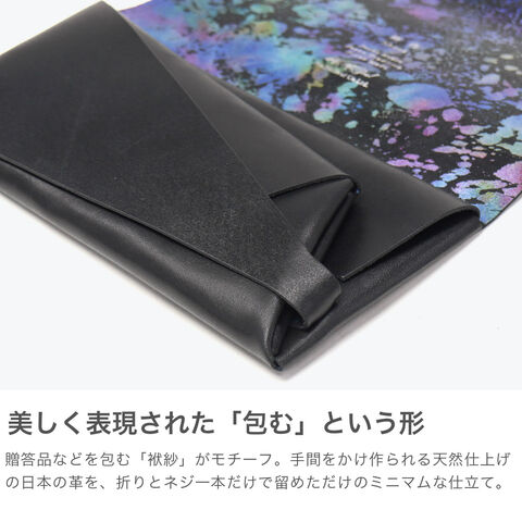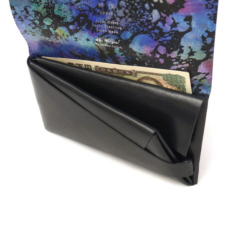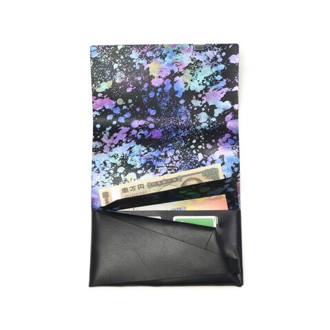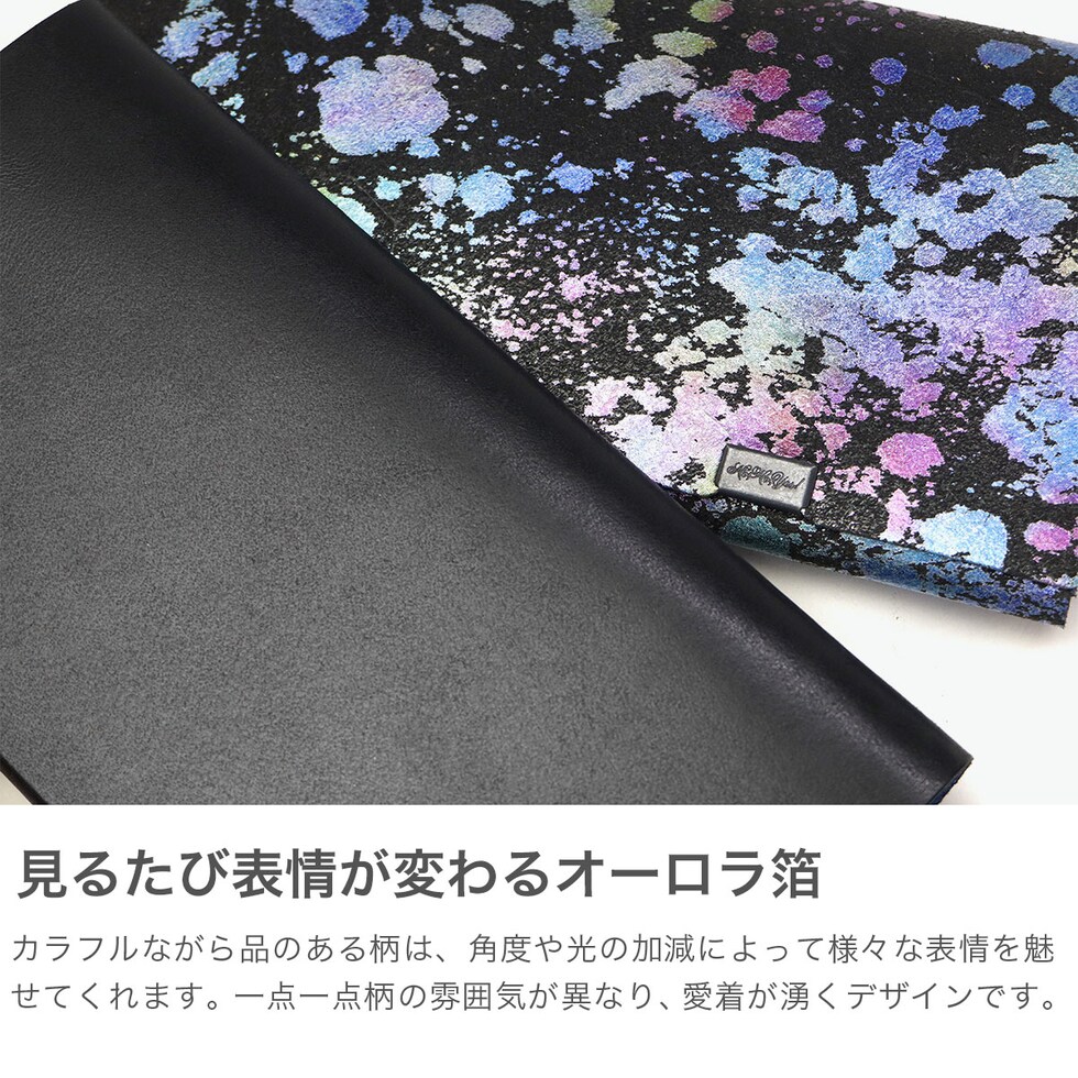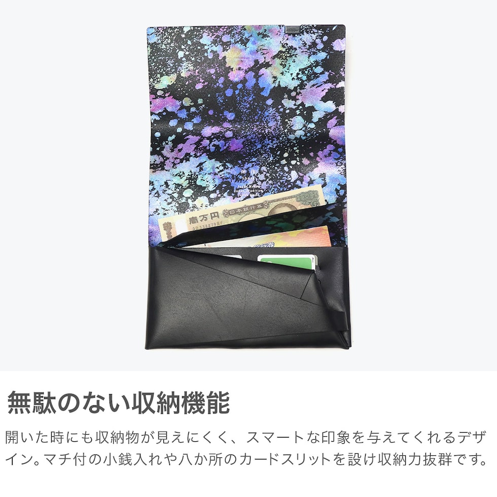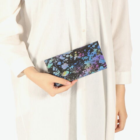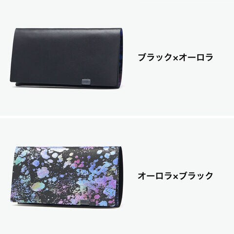| 人前で使いたくなる 個性派デザイン 上質なブラックレザーに虹色の雫が飛び散ったかのような箔を乗せた長財布。角度によって表情を変えるオーロラペイントが、個性的かつアーティスティックな印象を与えてくれます。また、箔面には箔剥がれを抑える為のコーティングを施しています。 |