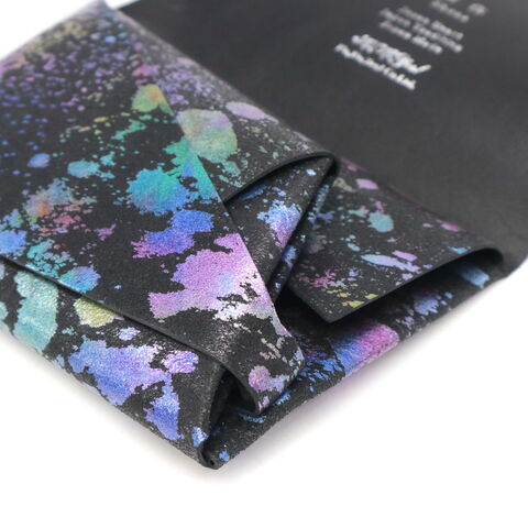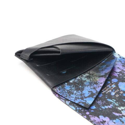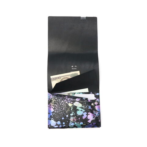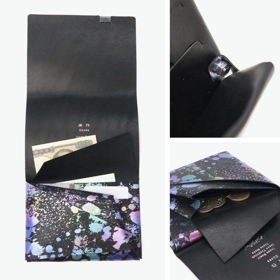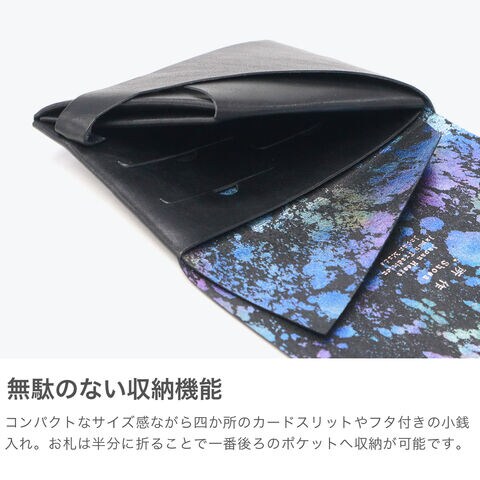 | 飽きることなく愉しめる 幻想的なカラーリング ペンキを散らしたかの様な孔雀色のカラーリングが目を惹く三つ折り財布。贈答品を包む「袱紗(ふくさ)」をモチーフにし、上質な一枚革を折って成形。縫わずに最後に1点をボルト&ナットで留め付けるだけという、日本の美学が表現されたデザインです。目立ちながらに品がある柄は、見る角度や光の加減により異なる表情を魅せ、見るだけでもウットリとした良い気分になれます。 |