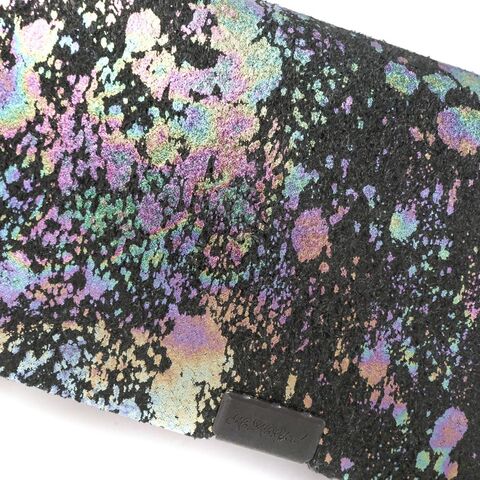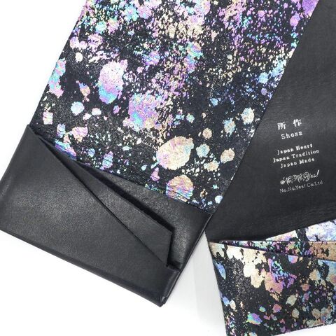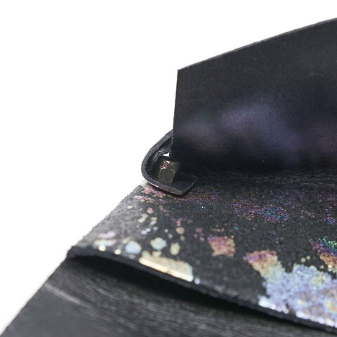 遊び心と気品溢れる 幻想的なカードケース 上質なブラックレザーに、まるでシャボンの雫が飛び散ったかのような箔を乗せ、幻想的な表情に仕上げたカードケース。贈答品を包む「袱紗(ふくさ)」をモチーフにし一枚革を折って成形。縫わずに最後に1点をボルト&ナットで留め付けるだけという、日本の美学が表現されたデザインです。ファスナーやボタンを使わずレザー本来の風合いを最大限に活かしています。 |