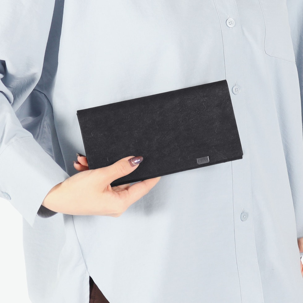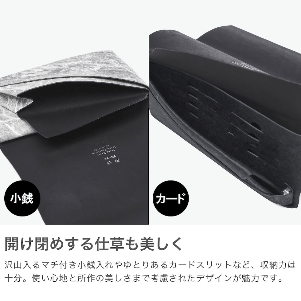 | 時と共に深みが増す 革と和紙の佇まい 幾重に重なる流線模様が行雲流水のような美しい動きを描く所作の和紙シリーズから登場した長財布。牛革の床面に和紙をボンディングし、和の趣と洗練を両立しました。使うほどに革は深みを増し、和紙も剥がれや毛羽立ちを含めて独自の風合いへと変化します。経年変化を存分に楽しめる味わい深いアイテムです。 |