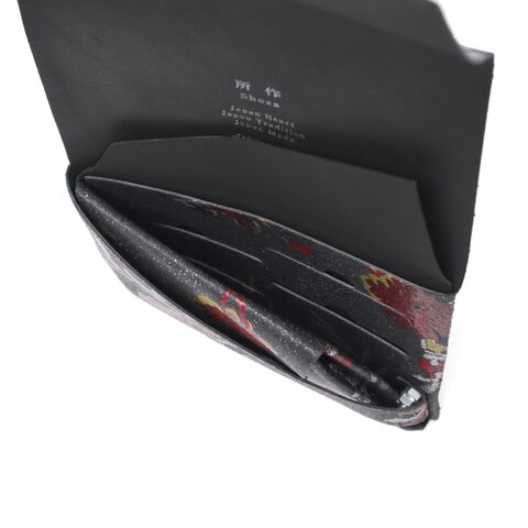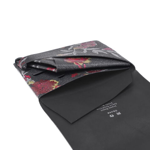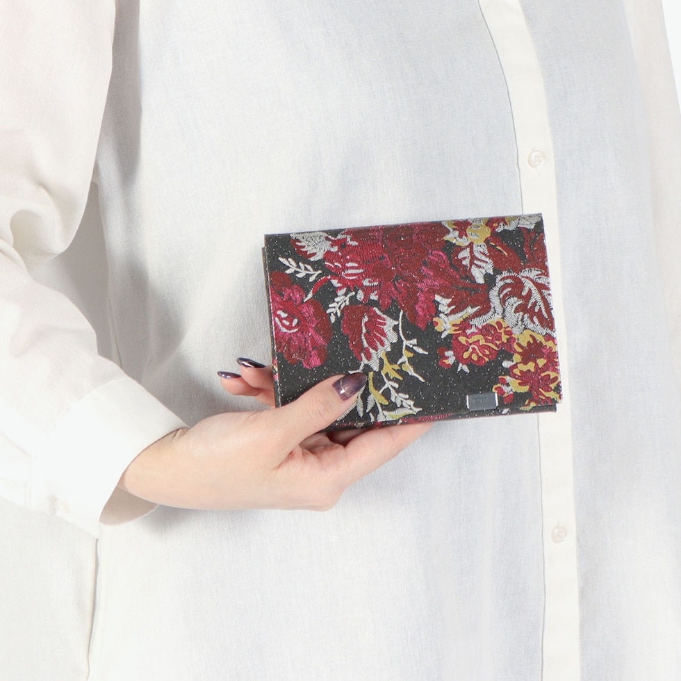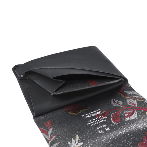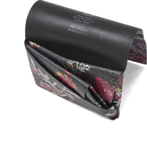 | 粋な絵柄で表現された 華やかさとコントラスト 黒地に花の刺繍をあしらったかのような絵柄が印象的な三つ折り財布。和の趣と華やかなコントラストが美しく、近くで見ると糸のように細やかなラインが重なり、ブランドらしい美意識が際立ちます。上質な牛革を一枚で折り上げた軽量スリム仕様で、使うほどに味わいが深まり、日々の装いに上品なアクセントを添えてくれます。 |