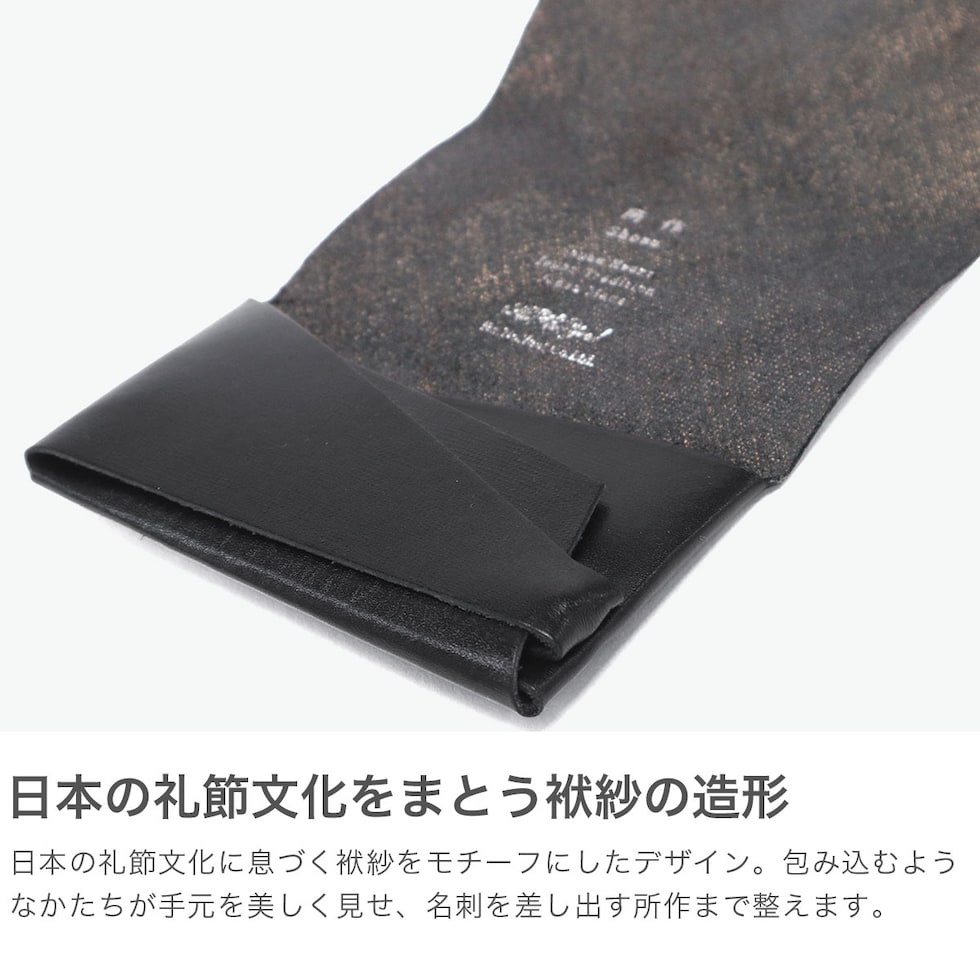 | 手元に凛とした美 一枚革の名刺入れ 袱紗をモチーフに、カードや名刺を包み込むように収める独創的な構造が魅力のカードケース。三つ折りのコンパクト設計ながら十分な収納力も確保しています。上質な牛革を一枚で折り上げた軽量スリム仕様で、使うほどに味わいが深まり、日々の装いに上品なアクセントを添えてくれます。手に取るたび美しさを実感でき、長く愛用いただけます。性別を問わず使えるため、大切な方へのギフトにもおすすめです。 |