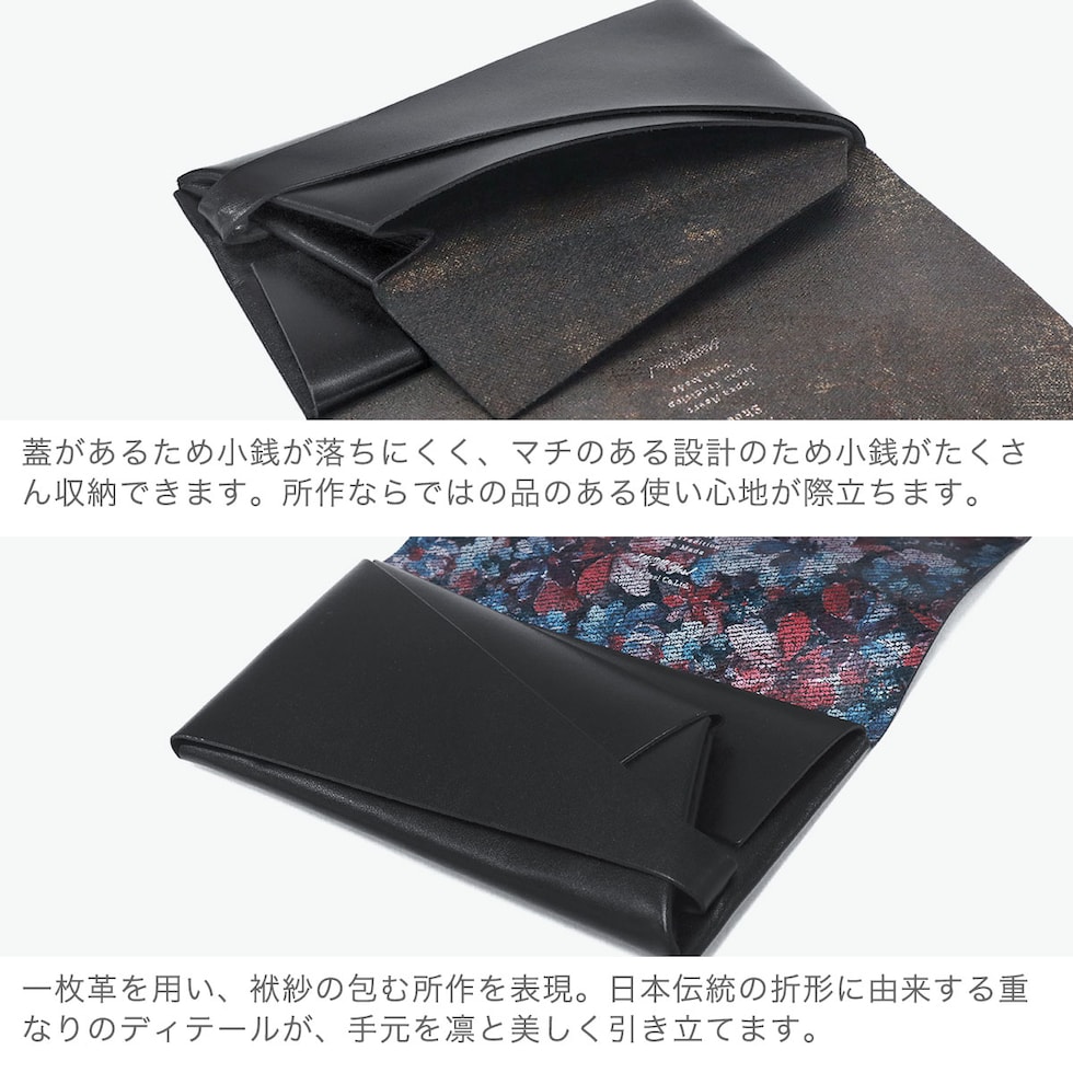 | 使うほど深まる味わい 日々に寄り添う長財布 袱紗をモチーフに、紙幣を包み込むように収める独創的な構造が魅力のロングウォレット。薄型で軽量ながら十分な収納力を備え、カードや小銭もすっきり整理できます。上質な牛革を一枚で折り上げた軽量スリム仕様で、使うほどに味わいが深まり、日々の装いに上品なアクセントを添えてくれます。手に取るたび美しさを実感でき、長く愛用いただけます。性別を問わず使えるため、大切な方へのギフトにもおすすめです。 |